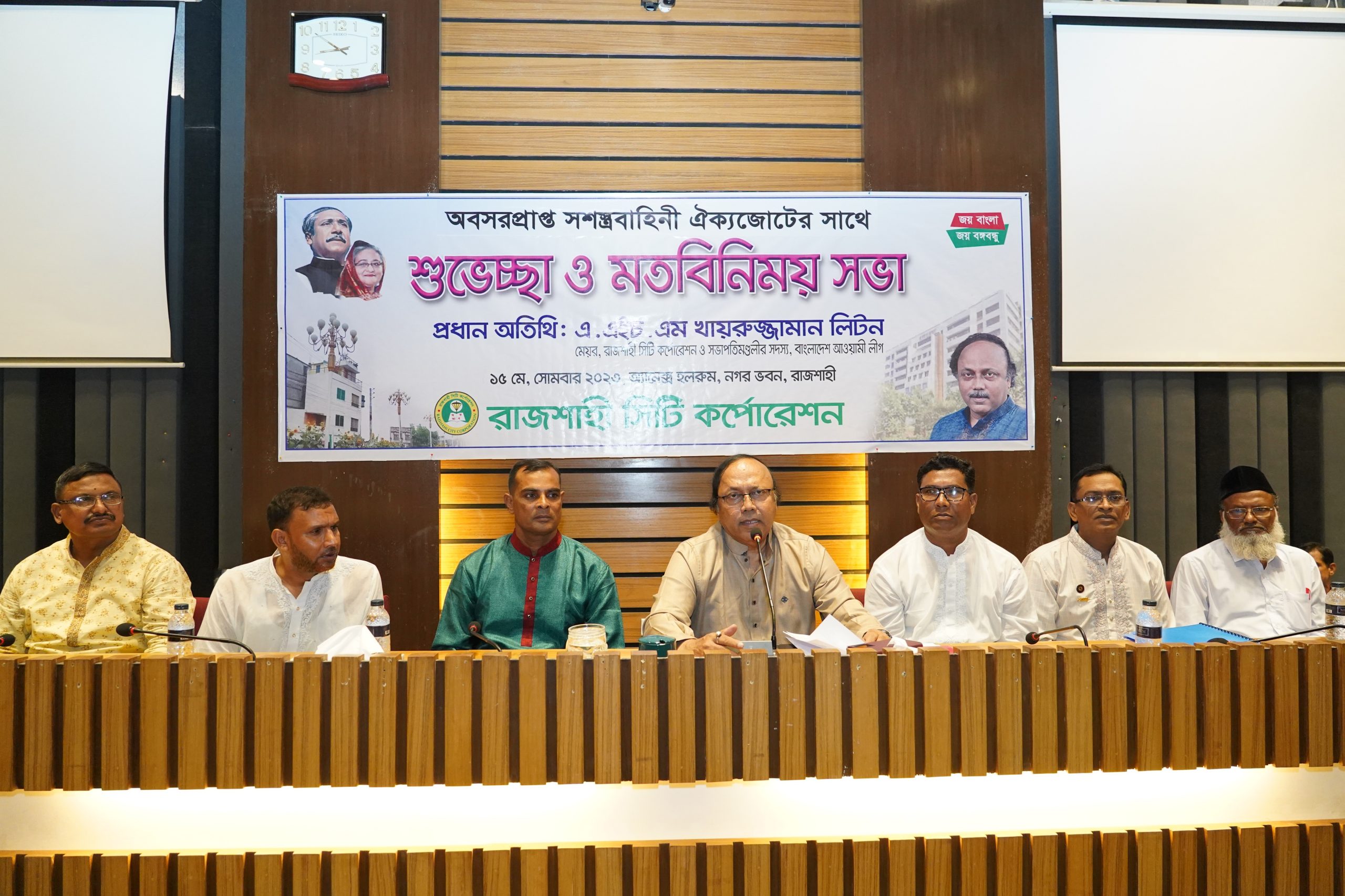 অবসরপ্রাপ্ত সশস্ত্রবাহিনী ঐক্যজোটের সাথে শুভেচ্ছা ও মতবিনিময় করেছেন বাংলাদেশ আওয়ামী লীগের সভাপতিমন্ডলীর সদস্য ও রাজশাহী সিটি কর্পোরেশনের মাননীয় মেয়র এ.এইচ.এম খায়রুজ্জামান লিটন। সোমবার রাত সাড়ে ৮টা থেকে সাড়ে ৯টা পর্যন্ত নগর ভবনের সিটি হলরুমে এই সভা অনুষ্ঠিত হয়। সভার শুরুতে রাসিক মেয়রকে ফুলেল শুভেচ্ছা ও সম্মাননা স্মারক প্রদান করেন অবসরপ্রাপ্ত সশস্ত্রবাহিনী ঐক্যজোটের নেতৃবৃন্দ।