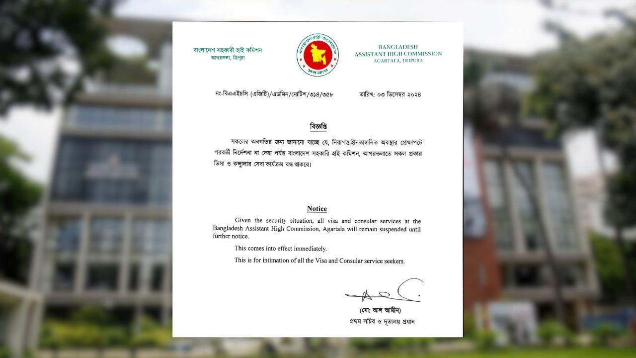 এক বিজ্ঞপ্তিতে বলা হয়, সকলের অবগতির জন্য জানানো যাচ্ছে যে, নিরাপত্তাহীনতাজনিত অবস্থার প্রেক্ষাপটে পরবর্তী নির্দেশ না দেওয়া পর্যন্ত বাংলাদেশ সহকারি হাইকমিশন, আগরতলাতে সকল প্রকার ভিসা ও কন্স্যুলার সেবা কার্যক্রম বন্ধ থাকবে।