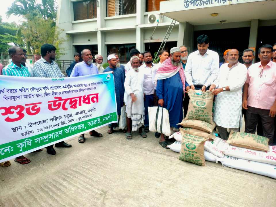 # মোঃ ফিরোজ আহমেদ, আত্রাই(নওগাঁ) প্রতিনিধি: নওগাঁর আত্রাইয়ে বিনামূল্যে প্রনোদনার সার-বীজ বিতরণ করা হয়েছে। বৃহস্পতিবার (১০ এপ্রিল) সকালে উপজেলা পরিষদ প্রাঙ্গনে ক্ষুদ্র ও প্রান্তিক কৃষকদের সহায়তার জন্য ২০২৪-২৫ অর্থ বছরে খরিপ মৌসুমে কৃষি প্রনোদনা কর্মসূচির আওতায় বিনামূল্যে আউশ ধান, তিল বীজ ও রাসায়নিক সার বিতরণের উদ্বোধন করা হয়।