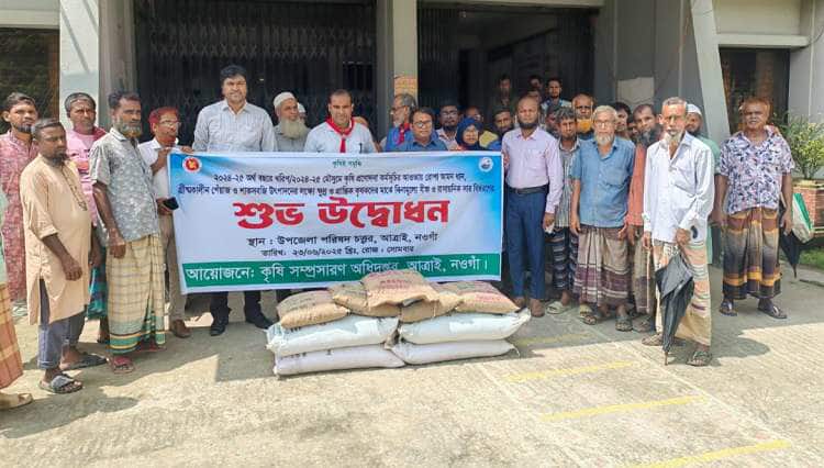# মোঃ রাসাদুদ জামান, আত্রাই, নওগাঁ প্রতিনিধিঃ নওগাঁর আত্রাইয়ে উপজেলা কৃষি সম্প্রসারণ অধিদপ্তরের আয়োজনে সোমবার (২৩ জুন) সকাল সাড়ে ১০টায় উপজেলা পরিষদ চত্বরে ২০২৪-২০২৫ অর্থবছরের খরিপ মৌসুমে কৃষি প্রণোদনা কর্মসূচীর আওতায় ১০৫০ জন কৃষকের মাঝে রোপা আমন ধানের বীজ (জনপ্রতি ৫ কেজি ধান ও ১০ কেজি এমওপি সার) এবং ১৩০ জন কৃষকের মাঝে গ্রীষ্মকালীন পেঁয়াজের বীজ (জনপ্রতি ৫ কেজি ), ডিএপি সার (২০ কেজি) ও এমওপি সার (২০ কেজি) বিতরণের উদ্বোধন করা হয়।পর্যায়ক্রমে বিতরণ কার্যক্রম চলমান থাকবে।