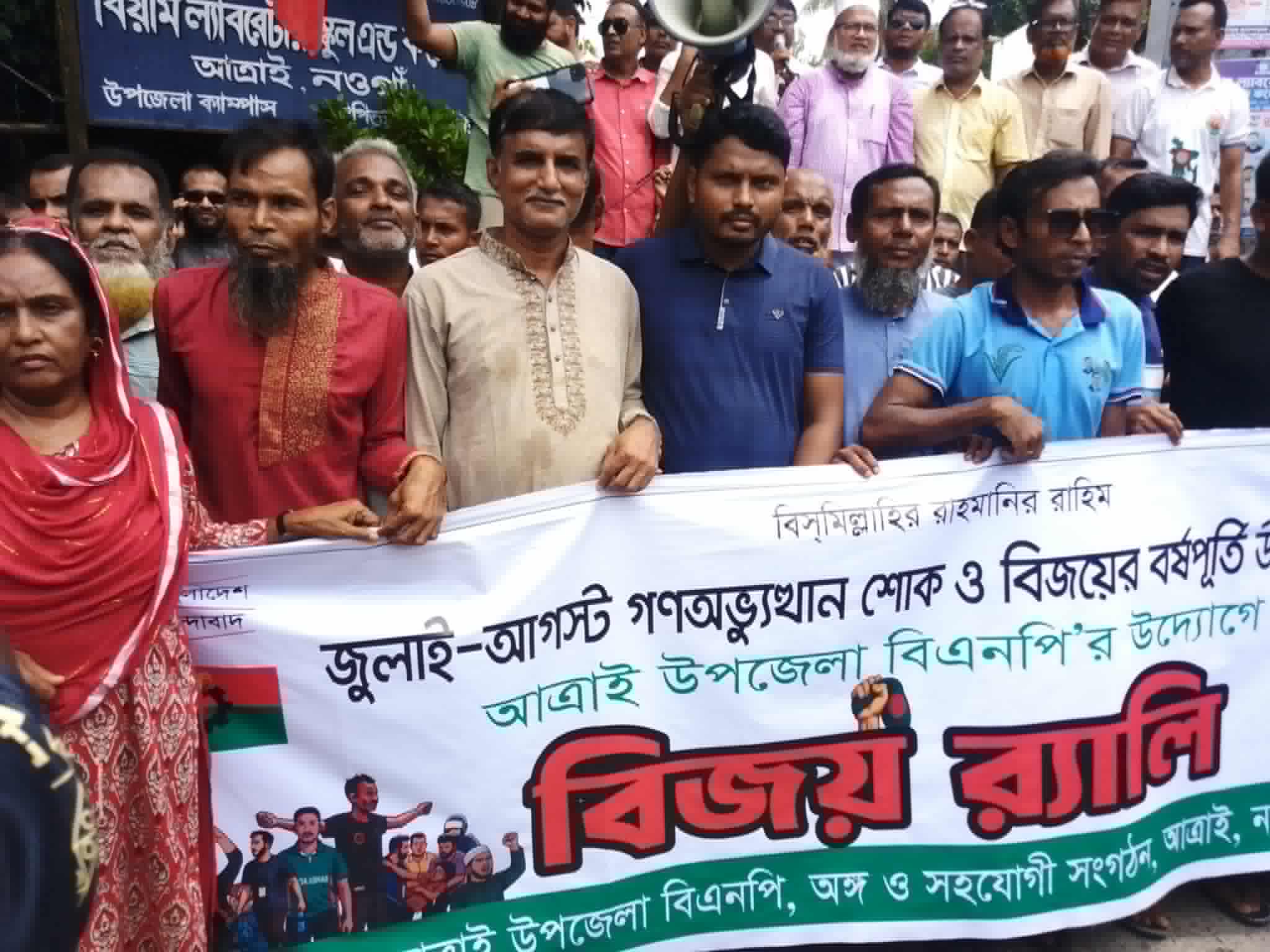 অনুষ্ঠিত মোঃ রাসাদুদ জামান , আত্রাই (নওগাঁ) প্রতিনিধি: নওগাঁর আত্রাইয়ে উপজেলা বিএনপি ও সহযোগী সংগঠনের যৌথ আয়োজনে জুলাই-আগস্ট গণঅভ্যুত্থানের শোক ও বিজয়ের বর্ষপূর্তি উপলক্ষে মঙ্গলবার (৫ আগস্ট) সকাল ১১টায় একটি বিজয় র্যালি ও আলোচনা সভা অনুষ্ঠিত হয়েছে।