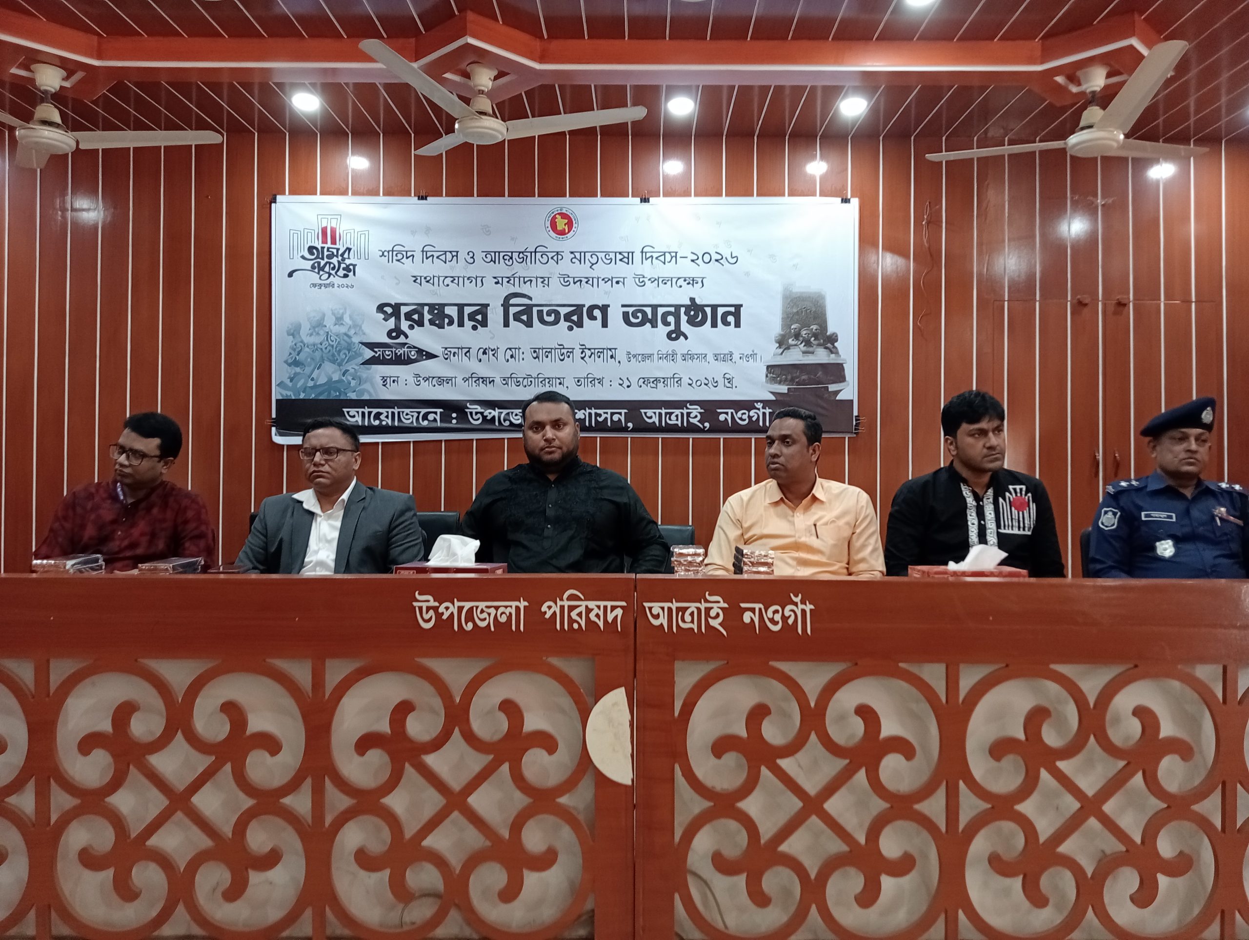 # পারভেজ গাদ্দাফী, আত্রাই (নওগাঁ) প্রতিনিধি: নওগাঁ জেলার আত্রাই উপজেলায় যথাযোগ্য মর্যাদায় পালিত হয়েছে মহান শহীদ দিবস ও আন্তর্জাতিক মাতৃভাষা দিবস–২০২৬। দিবসটি উপলক্ষে ২১ ফেব্রুয়ারি শনিবার সকাল সাড়ে এগারোটায় উপজেলা পরিষদ অডিটোরিয়ামে এক আলোচনা সভা ও দুপুর ১২:০০ টায় পুরস্কার বিতরণ অনুষ্ঠানের আয়োজন করে উপজেলা প্রশাসন।