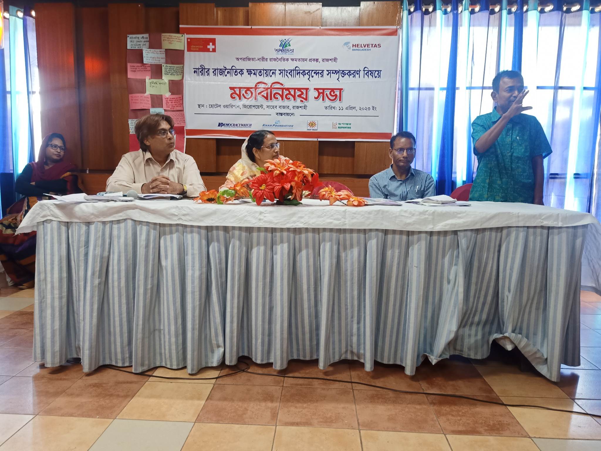 পরে নারীর ক্ষমতায়ন নিশ্চিতকরণে সাংবাদিকদের লিখিত মতামত ও সুপারিশসমূহ সকলের সামনে তুলে ধরেন দ্য ফাইনান্সিয়াল এক্সপ্রেসের রাজশাহী প্রতিনিধি মুঞ্জুয়ারা খাতুন ও ভোরের কাগজের রিপোর্টার আমানুল্লাহ আমান। মাঠপর্যায়ের তথ্য উপাত্ত নিয়ে আলোচনা করেন প্রকল্পটির পিসি মোর্শেদ আলম, ডিপিডি সাইফুল ইসলাম ও এএনজি শাহীনা লাইজু প্রমুখ। সভায় বক্তারা বলেন, নারীদের পিছিয়ে পড়তে রাজনৈতিক কোন্দল অনেকাংশে দায়ী। নারীদের এগিয়ে নিতে সমসাময়িক শিক্ষা দিতে হবে। তাদের জন্য তৈরি করতে হবে নিরাপদ পরিবেশ। নারীদের দাবি-দাওয়া নিয়ে তাদেরই এগিয়ে আসতে হবে। সভায় অংশ নেয়া নারীরাও তাদের সংগ্রামের নানা অভিজ্ঞতা তুলে ধরেন।#