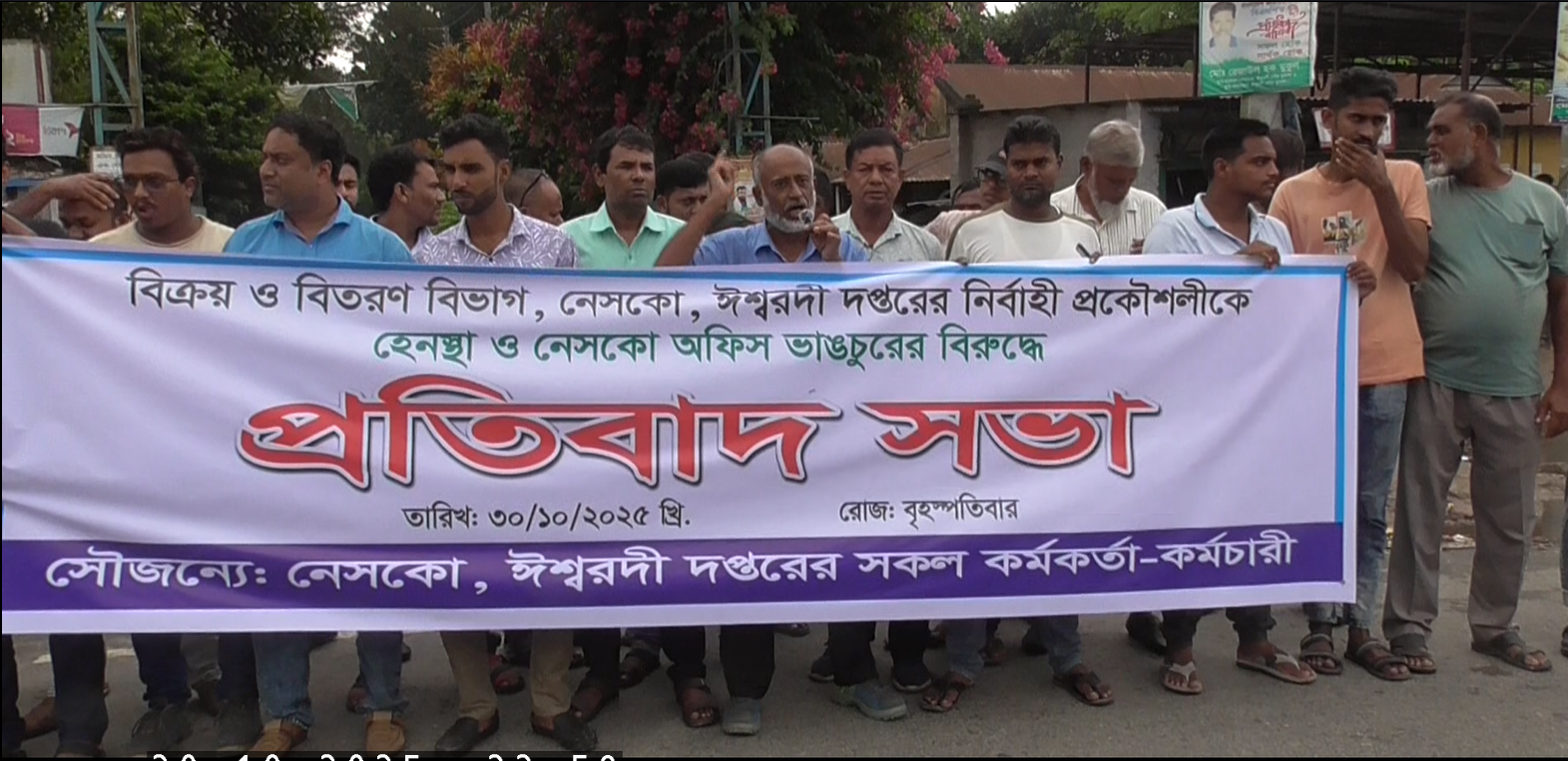 স্টাফ রিপোর্টার,ঈশ্বরদী,পাবনা : বিক্রয় ও বিতরণ বিভাগ নেসকো ঈশ্বরদী দপ্তরের নির্বাহী প্রকৌশলীকে হেনস্থা ও নেসকো অফিস ভাংচুরের বিরুদ্ধে প্রতিবাদ সভা ও বিক্ষোভ-সমাবেশ অনুষ্ঠিত হয়েছে। আজ বৃহস্পতিবার সকালে নেসকো ঈশ্বরদী দপ্তরের কর্মকর্তা-কর্মচারীদের পক্ষ থেকে নেসকো দপ্তর কার্যালয় ও ঈশ্বরদী-পাবনা মহাসড়কে এসব কর্মসুচির আয়োজন করা হয়।