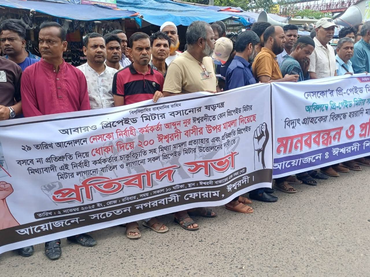 স্টাফ রিপোর্টার,ঈশ্বরদী.পাবনা: ঈশ্বরদীতে নেসকোর প্রি-পেইড মিটার প্রতিস্থাপনের বিরুদ্ধে চলমান আন্দোলনকে কেন্দ্র করে ২০১ জনের নামে নেসকো'র নির্বাহী প্রকৌশলীর মামলা দায়েরের ঘটনার প্রতিবাদে এবং মামলা প্রত্যাহারের দাবিতে বিক্ষোভ সমাবেশ করেছে বিক্ষুব্ধ জনতা। এসময় মিথ্যা মামলা প্রত্যাহারের জন্য নেসকোকে ৩ দিনের আল্টিমেটাম দেওয়া হয়েছে। রবিবার বেলা ১২ টায় ঈশ্বরদী পৌর শহরের স্টেশন রোডের এক নম্বর গেট এলাকায় আয়োজিত এক বিক্ষোভ সমাবেশে বক্তারা এ আল্টিমেটাম দেন।