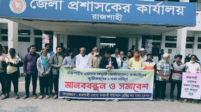 এক দফা দাবিতে রাজশাহী ওয়াসা কর্মচারীদের মানববন্ধন