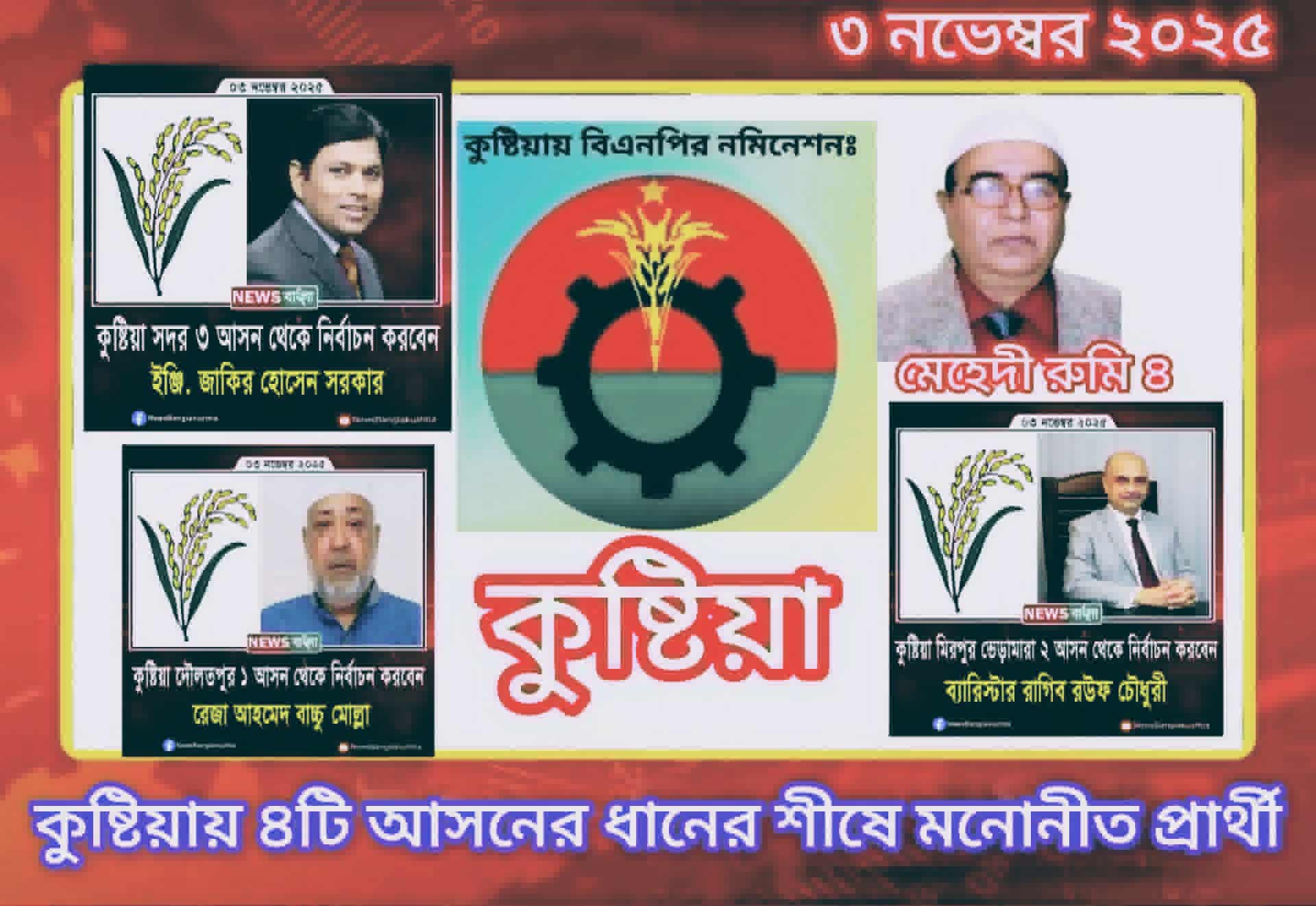 বিএনপির মহাসচিব মির্জা ফখরুল ইসলাম আলমগীর আনুষ্ঠানিকভাবে ঘোষণায় জানা যায়- কুষ্টিয়া-১ (দৌলতপুর) আসনে প্রার্থী হয়েছেন দলের রেজা আহমেদ বাচ্চু মোল্লা। কুষ্টিয়া-২ (মিরপুর-ভেড়ামারা) আসনে মনোনয়ন পেয়েছেন ব্যারিষ্টার রাগীব রউফ চৌধুরী। কুষ্টিয়া-৩ (সদর) আসনে প্রার্থী হয়েছেন প্রকৌশলী জাকির হোসেন সরকার। কুষ্টিয়া-৪ (খোকসা-কুমারখালী) আসনে মনোনয়ন পেয়েছেন জেলা বিএনপির সাবেক সভাপতি সৈয়দ মেহেদী আহমেদ রুমী।