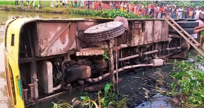 খোঁজ নিয়ে জানা গেছে , শুক্রবার ভোগডাঙ্গা ইউনিয়নের রাজারহাট এলাকার বকুলতলা গ্রামের নালকা মিয়ার মেয়ে লায়লা খাতুনের সঙ্গে নাগেশ্বরী উপজেলার পাখির হাট এলাকার আনোয়ার হোসেনের বিয়ে হয়। শনিবার সন্ধ্যায় বরের বাড়িতে বউভাত খেতে অর্ধশত যাত্রী নিয়ে এপি ট্রাভেলসের একটি বাস বরের বাড়ি যাচ্ছিল। পথে বাসটি নিয়ন্ত্রণ হারিয়ে পুকুরে পড়ে। এতে শিশুসহ ১০ জন আহত হন। স্থানীয়রা আহতদের উদ্ধার করে বিভিন্ন ক্লিনিক হাসপাতালে চিকিৎসার জন্য পাঠিয়ে দেয়।
