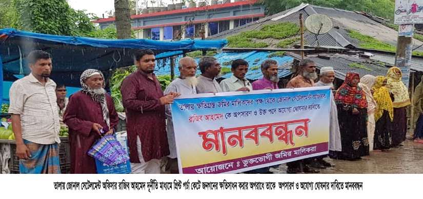 খুলনার জোনাল সেটেলমেন্ট অফিসার রাজিব আহমেদ কে অপসারণ ও অযোগ্য ঘোষনার দাবিতে তালায় মানববন্ধন
