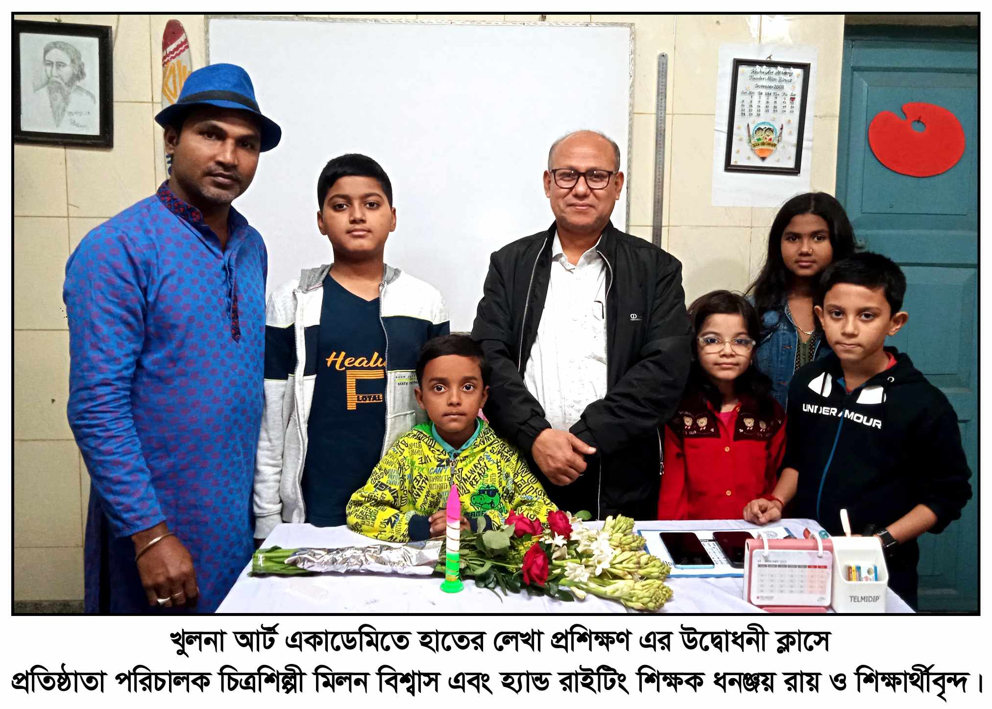 প্রেস বিজ্ঞপ্তি: ৬ই জানুয়ারি সোমবার বিকাল ৪ঘটিকায় খুলনা ইকবাল নগর স্কুলের পূর্ব পাশে ৩৬, আয়েশা কটেজ এর নিচ তলায় খুলনা আর্ট একাডেমিতে হাতের লেখা প্রশিক্ষণ কোর্সের শুভ উদ্বোধনী অনুষ্ঠানে সম্মানিত করিমুন্নেছা মডেল স্কুলের হ্যান্ড রাইটিং শিক্ষক বাবু ধনঞ্জয় রায়ের আগমনে প্রথমেই খুলনা আর্ট একাডেমির পক্ষ থেকে প্রতিষ্ঠাতা পরিচালক চিত্রশিল্পী মিলন বিশ্বাস ও সহকারী পরিচালক শিলা বিশ্বাস ফুল দিয়ে বরণ করে নেন। তাৎক্ষণিক আজকের কোমলমতি শিশু শিক্ষার্থীদের দ্বারা মোমবাতি প্রজ্জ্বলন করে উদ্বোধনের শুভ সূচনা হয়।