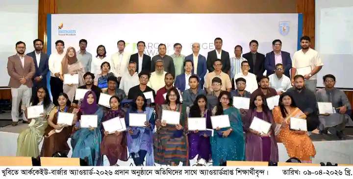 শহিদুল্লাহ্ আল আজাদ. স্টাফ রিপোর্টারঃ খুলনা বিশ্ববিদ্যালয়ের একাডেমিক উৎকর্ষের স্বীকৃতি হিসেবে আর্ককেইউ-বার্জার অ্যাওয়ার্ড-২০২৬ পেয়েছেন স্থাপত্য ডিসিপ্লিনের ৩১ জন শিক্ষার্থী। আজ ০৯ এপ্রিল বৃহস্পতিবার বিকালে বিশ্ববিদ্যালয়ের সাংবাদিক লিয়াকত আলী মিলনায়তনে আয়োজিত এক অনুষ্ঠানে অ্যাওয়ার্ডপ্রাপ্ত শিক্ষার্থীদের হাতে সম্মাননা ক্রেস্ট, সনদপত্র ও চেক তুলে দেওয়া হয়।আর্ককেইউ-বার্জার ‘থিসিস অব দ্য ইয়ার-২০২৬’-এ প্রথম স্থান অর্জন করেন মো. মোস্তাকিম বিল্লাহ। দ্বিতীয় হন তারানা তাহসিন তন্নি এবং তৃতীয় স্থান অর্জন করেন সুমাইয়া খাতুন। কমেন্ডেশন অ্যাওয়ার্ড পান রাতুল হাসান রাব্বি ও শফিউল ইসলাম হৃদয়।