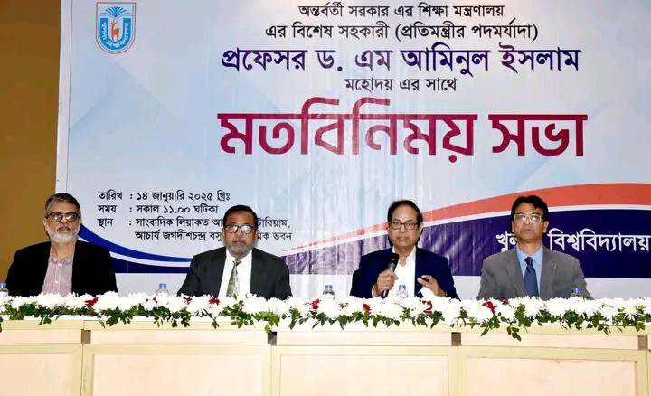 শহিদুল্লাহ্ আল আজাদ. খুলনা ব্যুরোঃ খুলনায় শিক্ষা মন্ত্রণালয়ের বিশেষ সহকারী (প্রতিমন্ত্রীর পদমর্যাদা) প্রফেসর ড. এম আমিনুুল ইসলাম বলেছেন, খুলনা বিশ্ববিদ্যালয়ে যেসকল সাবজেক্ট চালু রয়েছে, তার মধ্যে অনেকগুলোই উন্নত বিশ্বের সাথে সামঞ্জস্যপূর্ণ। তাই এ বিশ্ববিদ্যালয়কে একটি বিশেষায়িত বিশ্ববিদ্যালয় বলা যায়। গবেষণার মাধ্যমে এ বিশ্ববিদ্যালয়ের গবেষকরা ইতোমধ্যে তাদের সক্ষমতা জানান দিয়েছেন। বিশেষ করে সুন্দরবন ও উপকূলীয় লবণাক্ত এলাকায় কৃষি উৎপাদনে তাদের গবেষণা অত্যন্ত চমৎকার। বিশ্ববিদ্যালয়ের শিক্ষকদের গবেষণা হওয়া উচিত জনকল্যাণ ও বাস্তবমুখী। যার মাধ্যমে মানুষের জীবনমান উন্নয়নে কার্যকর ভূমিকা রাখা যায়। মঙ্গলবার ১৪ জানুয়ারি বেলা ১১টায় খুলনা বিশ্ববিদ্যালয়ের আচার্য জগদীশচন্দ্র বসু একাডেমিক ভবনের সাংবাদিক লিয়াকত আলী মিলনায়তনে বিশ্ববিদ্যালয়ের শিক্ষকদের সাথে এক মতবিনিময় সভায় প্রধান অতিথির বক্তৃতায় তিনি এ কথা বলেন।