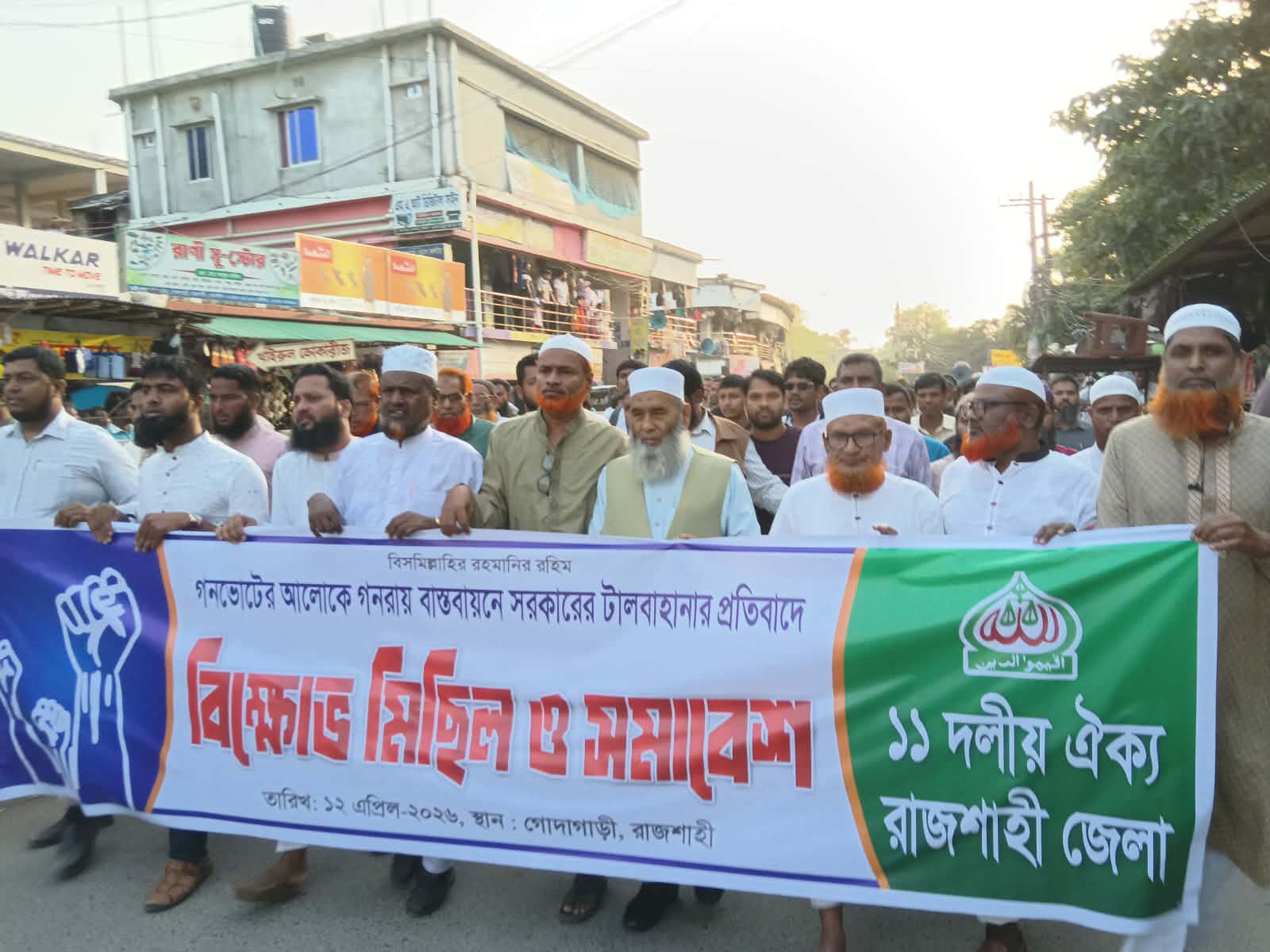 # জাহিদুল ইসলাম, গোদাগাড়ী প্রতিনিধি: গণভোটের রায় দ্রুত বাস্তবায়নের দাবিতে রাজশাহীর গোদাগাড়ী উপজেলায় বিক্ষোভ মিছিল ও সমাবেশ করেছে বাংলাদেশ জামায়াতে ইসলামী রাজশাহী জেলা শাখা।রোববার (১২ এপ্রিল) বিকাল সাড়ে ৪ টার দিকে ডাইংপাড়া চত্বর থেকে মিছিলটি শুরু হয়ে উপজেলার বিভিন্ন সড়ক প্রদক্ষিণ করে উপজেলা পরিষদের সামনে এসে সমাবেশে মিলিত হয়।
