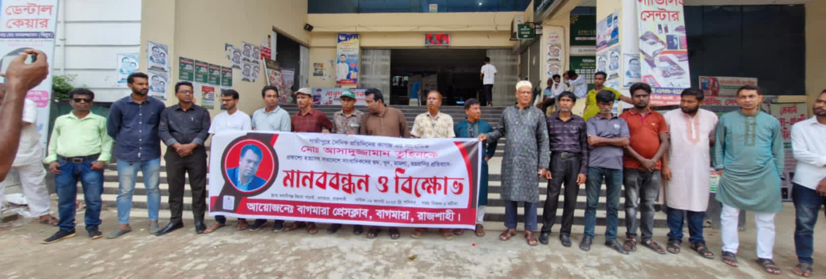# বাগমারা প্রতিনিধিঃ শনিবার বিকেল ৩ টায় ভবানীগঞ্জ জিরো পয়েন্ট নিউমার্কেটের সামনে মানববন্ধনের আয়োজন করা হয়। এতে বাগমারা প্রেসক্লাব ছাড়াও জেলার বিভিন্ন প্রিন্ট, ইলেকট্রনিক ও অনলাইন গণমাধ্যমে কর্মরত সংবাদকর্মীরা একাত্মতা প্রকাশ করেন।