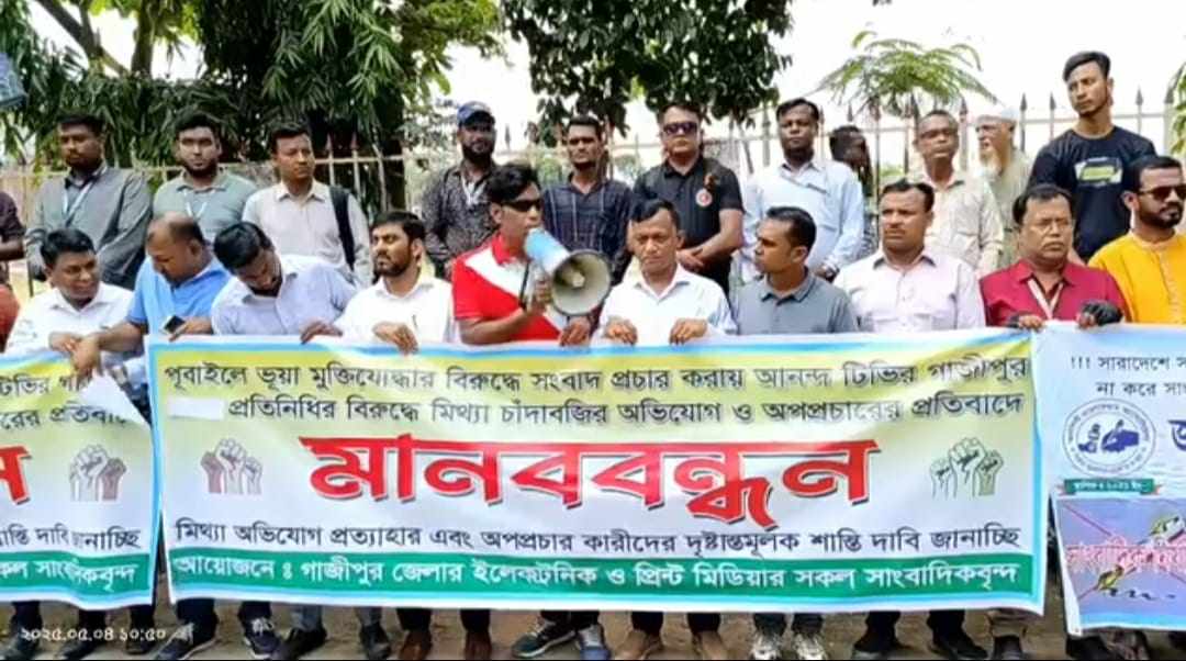 রোববার (৪ ঠা মে) সকাল সাড়ে ১০ টায় এই মানববন্ধন গাজীপুর জেলা প্রশাসক কার্যালয়ের সামনে অনুষ্ঠিত হয়। সাংবাদিকরা এই মিথ্যা অভিযোগের তীব্র নিন্দা ও ক্ষোভ প্রকাশ করেন। তারা এই ঘটনাকে মুক্ত গণমাধ্যম, স্বাধীন মত প্রকাশ এবং সত্যনিষ্ঠ অনুসন্ধানী সাংবাদিকতার ওপর সরাসরি আঘাত হিসেবে মন্তব্য করেন।