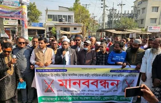 # গোদাগাড়ী প্রতিনিধি: রাজশাহীর গোদাগাড়ীতে নর্দার্ন ইলেকট্রিসিটি সাপ্লাই কোম্পানি (নেসকো) কর্তৃক স্থাপিত প্রিপেইড মিটার বাতিলের দাবিতে মানববন্ধন হয়েছে। গোদাগাড়ী নাগরিক স্বার্থ সংরক্ষণ কমিটির ব্যানারে রবিবার (১৪ ডিসেম্বর) সকাল ১০ টায় গোদাগাড়ী সদর ডাইংপাড়া মোড়ে এ মানবববন্ধন হয়। এতে বিভিন্ন সামাজিক ও রাজনৈতিক সংগঠনের নেতাকর্মীদের পাশাপাশি নানা শ্রেণি-পেশার মানুষ অংশ নেন।