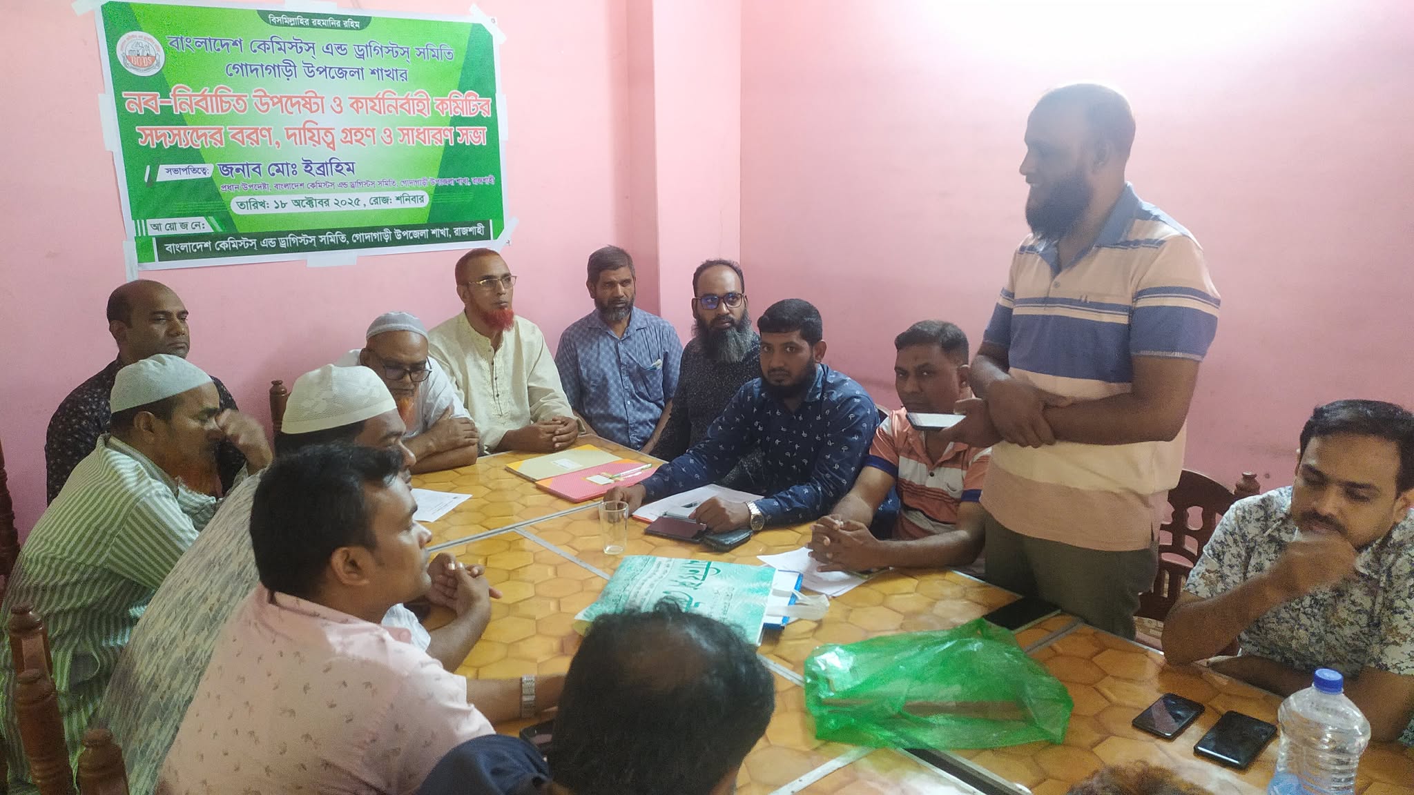 বিশেষ প্রতিনিধি,রাজশাহী: বাংলাদেশ কেমিস্ট অ্যান্ড ড্রাগিস্ট সমিতি (বিসিডিএস) গোদাগাড়ী উপজেলা শাখার নবনির্বাচিত উপদেষ্টা ও কার্যনির্বাহী কমিটির সদস্যদের বরণ, দায়িত্ব গ্রহণ ও সাধারণ সভা অনুষ্ঠিত হয়েছে। শনিবার (১৮ অক্টোবর ২০২৫) গোদাগাড়ীতে অনুষ্ঠিত এ অনুষ্ঠানে সভাপতিত্ব করেন সমিতির প্রধান উপদেষ্টা মোঃ ইব্রাহিম হোসেন।