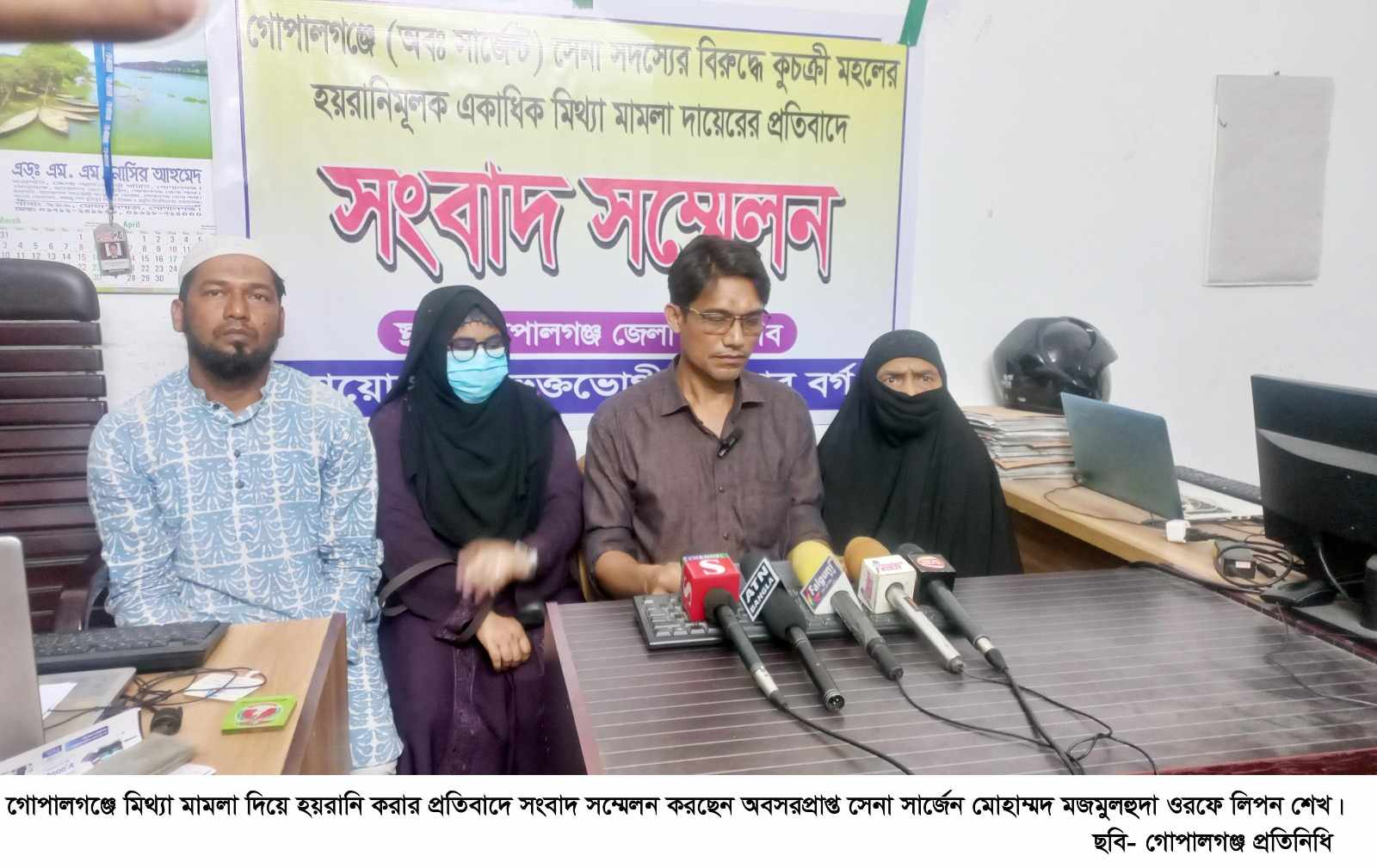 গোপালগঞ্জে স্ত্রীকে দিয়ে একের পর এক মিথ্যা মামলা দিয়ে অবসরপ্রাপ্ত সেনা সদস্য ছোট ভাইকে হয়রানি ও পরিবারসহ বাড়ি-ঘর ছাড়া করার অভিযোগ ওঠেছে বড় ভাইয়ের বিরুদ্ধে। বৃহস্পতিবার বেলা সাড়ে ১১টায় গোপালগঞ্জ জেলা প্রেসক্লাবে অনুষ্ঠিত এক সংবাদ সম্মেলনে ভুক্তভোগী সেনা বাহিনীর অবসরপ্রাপ্ত সার্জেন্ট সদর উপজেলার ঘোষেরচর উত্তর পাড়া গ্রামের মৃত. মিন্টু শেখের ছেলে মোহাম্মদ মজমুল হুদা ওরফে লিপন শেখ এ অভিযোগ করেন।