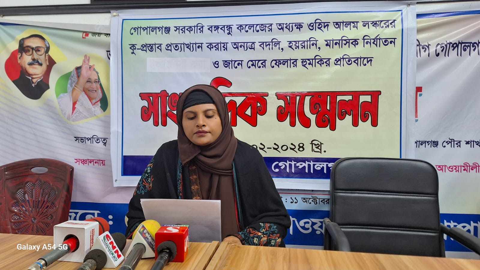 গোপালগঞ্জে সরকারি বঙ্গবন্ধু কলেজের অধ্যক্ষ ওহিদ আলম লস্করের কু-প্রস্তাব প্রত্যাখ্যান করায় অন্যত্র বদলি, হয়রানি, মানসিক নির্যাতন সহ প্রাণে মেরে ফেলার হুমকির প্রতিবাদে সংবাদ সম্মেলন অনুষ্ঠিত হয়েছে। সোমবার (১৯ ফেব্রুয়ারি) সকাল ১০ টায় বাংলাদেশ মফস্বল সাংবাদিক ইউনিয়ন গোপালগঞ্জ জেলা কার্যালয়ে ভুক্তভোগী তমা খানম এ সংবাদ সম্মেলনের আয়োজন করেন।