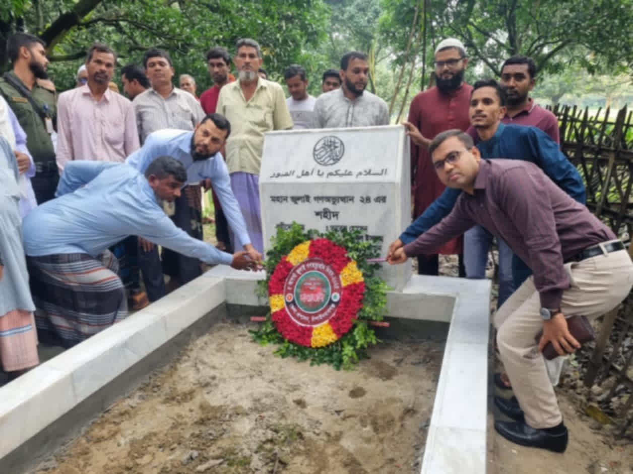 # সারওয়ার জাহান সুমন, গোমস্তাপুরঃ চাঁপাইনবাবগঞ্জের গোমস্তাপুরে যথাযোগ্য মর্যাদায় জুলাই গণঅভ্যুত্থান দিবস পালিত হয়েছে। দিবসটি উপলক্ষে শহিদ তারেক হোসেনের সমাধিতে পুষ্পস্তবক অর্পণ ও দোয়া করা হয়।
