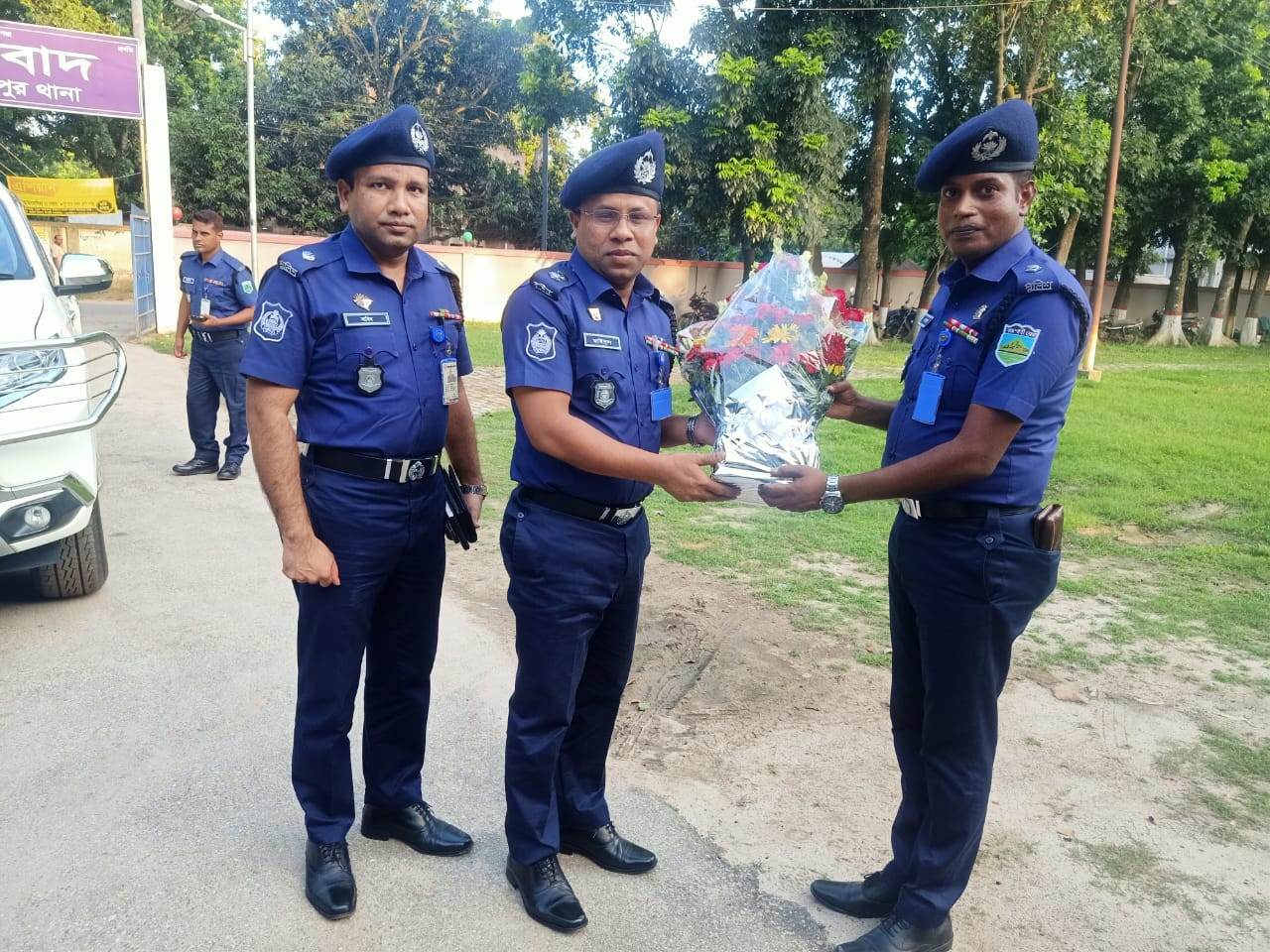 ক্যাপশন: চাঁপাইনবাবগঞ্জ পুলিশ সুপার ছাইদুল হাসান পিপিএমকে গোমস্তাপুর থানার অফিসার ইনচার্জ (ওসি) মাহবুবুর রহমান ফুলেল শুভেচ্ছা দিয়ে অভিবাদন জানান।