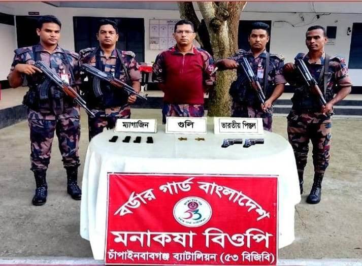আজও দেশ রক্ষায় সীমান্তে একনিষ্ঠ দায়িত্ব পালনে তাঁদের অগ্রনী ভূমিকার বিকল্প নেই। এরই ধারাবাহিকতায় বিশেষ তথ্যের ভিত্তিতে ২৯ সেপ্টেম্বর রাত ৪ টার সময় চাঁপাইনবাবগঞ্জ ব্যাটালিয়ন ৫৩ বিজিবি'র অধিনায়কের নেতৃত্বে মনাকষা বিওপির একটি বিশেষ টহলদল চাঁপাইনবাবগঞ্জ জেলার শিবগঞ্জ থানাধীন মনাকষা ইউনিয়নের রামনাথপুর গ্রামে নদী সংলগ্ন এলাকায় একটি বিশেষ অভিযান পরিচালনা করে ২টি বিদেশী পিস্তল, ৪টি ম্যাগাজিন ও ১০ রাউন্ড গুলি জব্দ করতে সক্ষম হয়।