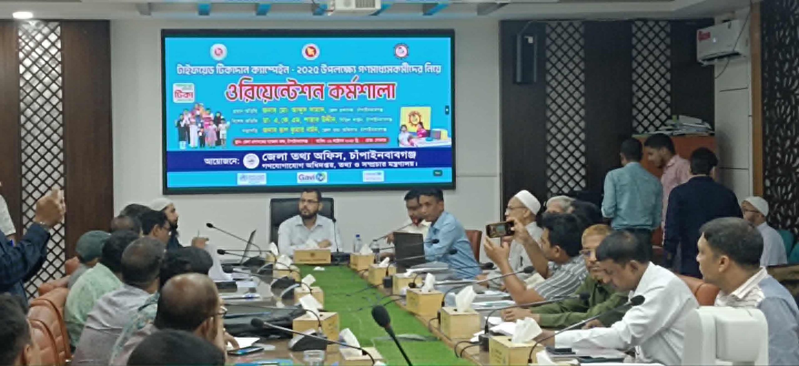 মোহাঃ হারুন অর রশিদ, চাঁপাইনবাবগঞ্জ প্রতিনিধিঃ “শিশু, কিশোর-কিশোরী ও নারী উন্নয়নে সচেতনতা মূলক প্রচার কার্যক্রম” প্রকল্পের আওতায় ইউনিসেফ বাংলাদেশের সহযোগিতায় টাইফয়েড টিকাদান ক্যাম্পেইন উপলক্ষে চাঁপাইনবাবগঞ্জে কর্মরত সাংবাদিকদের নিয়ে এক ওরিয়েন্টেশন কর্মশালা অনুষ্ঠিত হয়েছে। আজ ৬ অক্টোবর (সোমবার) দুপুরে জেলা প্রশাসকের সম্মেলন কক্ষে জেলা প্রশাসন ও জেলা তথ্য অফিসের আয়োজনে এ কর্মশালা অনুষ্ঠিত হয়।