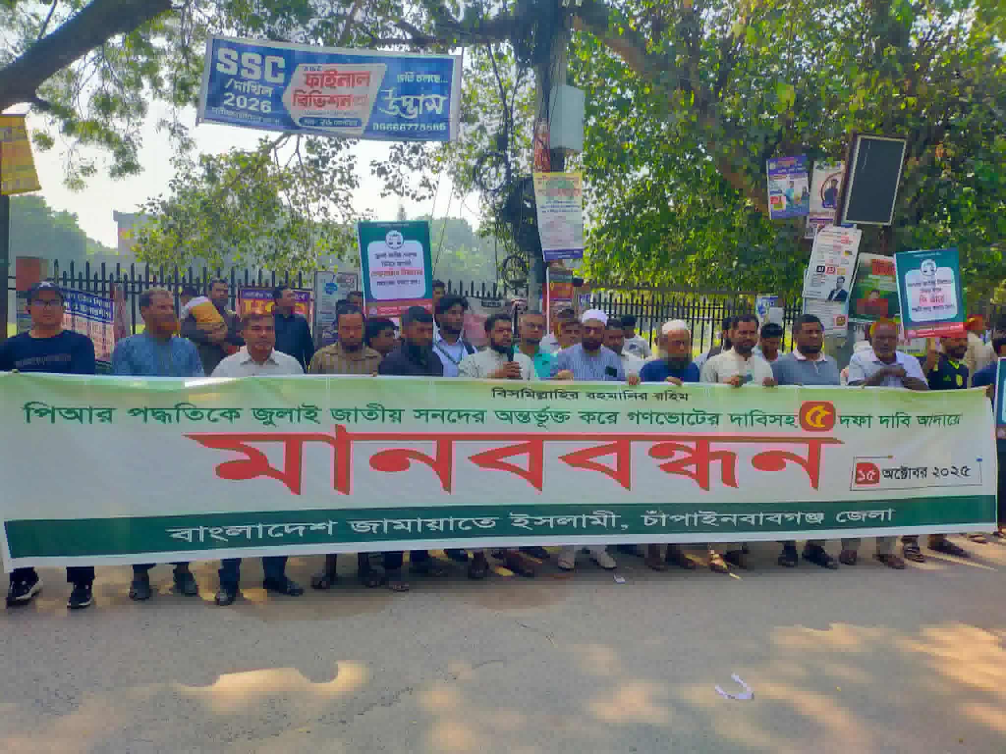 চাঁপাইনবাবগঞ্জ প্রতিনিধিঃ পিআর পদ্ধতিকে জুলাই জাতীয় সনদের অন্তর্ভূক্ত করে গণভোটের দাবীসহ ৫ দফা দাবীতে মানববন্ধন অনুষ্ঠিত হয়েছে চাঁপাইনবাবগঞ্জে। বুধবার সকালে জেলা প্রশাসকের কার্যালয়ের সামনের চত্বরে এই মানববন্ধন কর্মসূচীর আয়োজন করে বাংলাদেশ জামায়াতে ইসলামী চাঁপাইনবাবগঞ্জ জেলা শাখা।