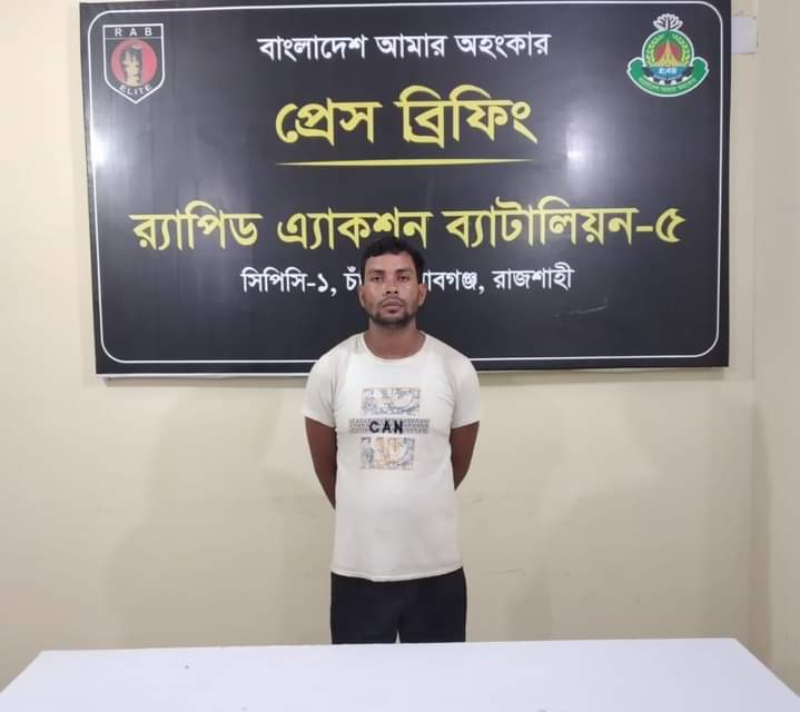 চাঁপাইনবাবগঞ্জ জেলার সদর পৌরসভার ঢাকা বাসস্ট্যান্ড এলাকার লালবোর্ডিং এর সামনে রাস্তার বিপরীত পাশে কৃষি মার্কেটের মেসার্স রহমান ট্রেডার্স দোকানের সামনে থেকে ১ কেজি ১২ গ্রাম হেরোইন সহ ০১ জন মাদক ব্যবসায়ীকে গ্রেফতার করেছে র্যাব-৫। গ্রেফতারকৃত হলেন লালমনিরহাট জেলার পাটগ্রাম উপজেলার পূর্ব জগতবেড় গ্রামের মোঃ হাকিম উদ্দিন ও মোছাঃ হাফিজা খাতুনের ছেলে মোঃ আনোয়ার হোসেন (২৯)।