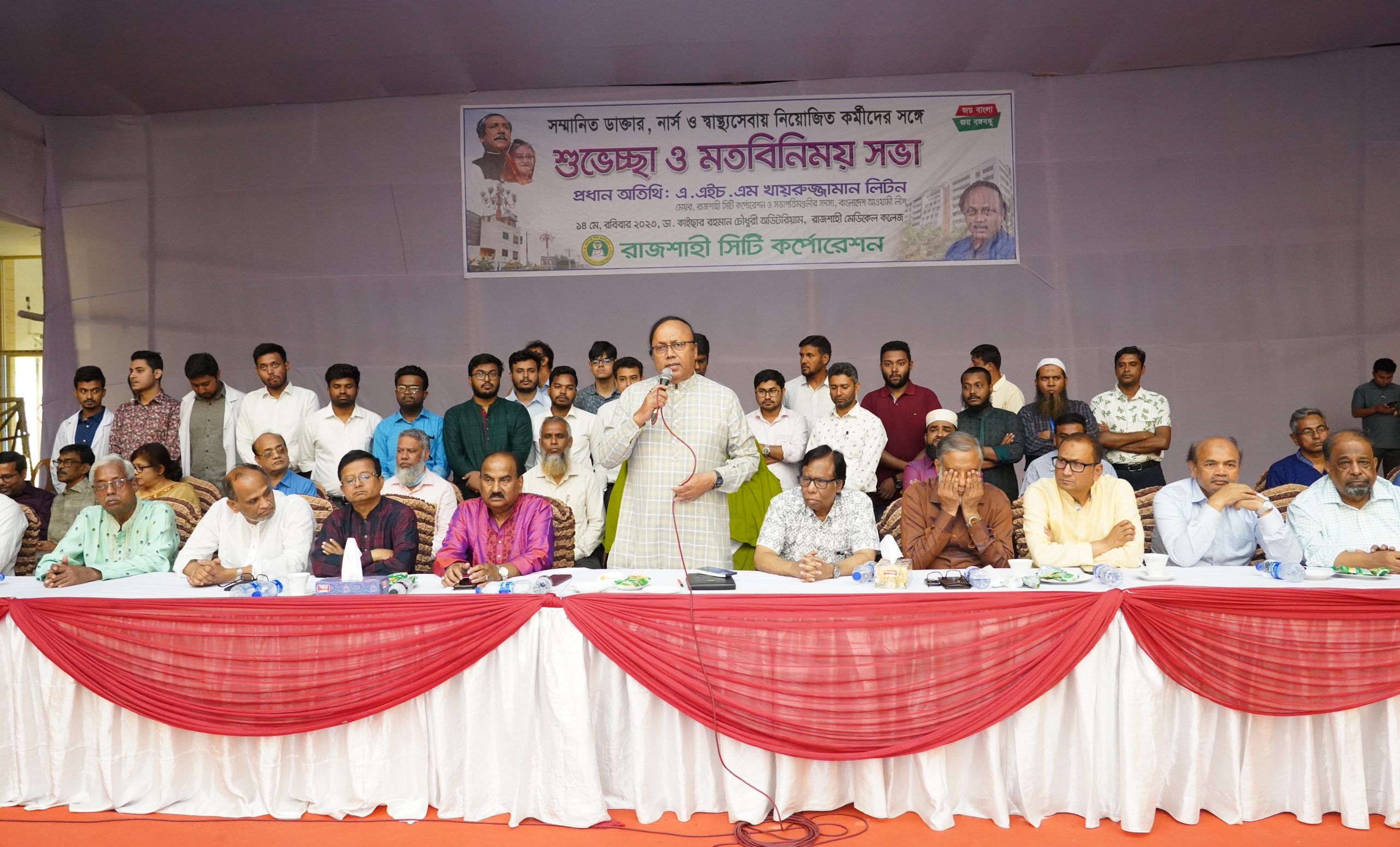 রাজশাহীর চিকিৎসক, নার্স ও স্বাস্থ্যসেবায় নিয়োজিত কর্র্মীদের সঙ্গে শুভেচ্ছা ও মতবিনিময় সভা অনুষ্ঠিত হয়েছে। রোববার সকাল সাড়ে ১১টা হতে দুপুর আড়াইটা পর্যন্ত রাজশাহী মেডিকেল কলেজের ডা. কাইছার রহমান চৌধুরী মিলনায়তনে আয়োজিত মতবিনিময় সভায় প্রধান অতিথি হিসেবে উপস্থিত ছিলেন বাংলাদেশ আওয়ামী লীগের সভাপতিমণ্ডলীর সদস্য ও রাজশাহী সিটি কর্পোরেশনের মেয়র এএইচএম খায়রুজ্জামান লিটন।