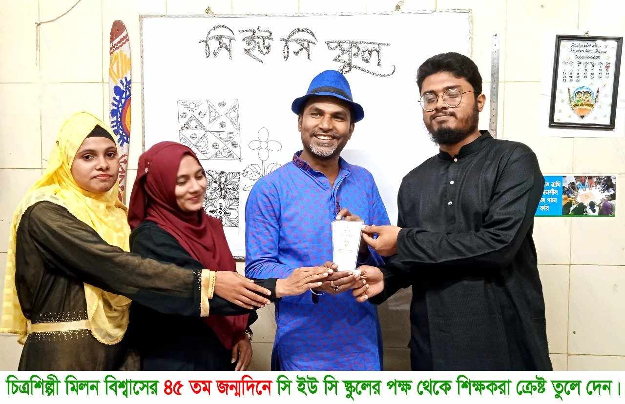 ক্লাস শেষ হতে না হতে খুলনা সামাজিক সংগঠন সি ইউ সি পরিচালিত সুবিধা বঞ্চিত শিশুদের নিয়ে কাজ করা প্রতিষ্ঠান সি ইউ সি স্কুল এর প্রধান শিক্ষক মুজাহিদ হোসেন মিরাজ, সহকারী প্রধান শিক্ষিকা কারিমা আক্তার, সহকারী প্রধান শিক্ষিকা মীম আক্তার মনিকা।কেক এবং ফুল নিয়ে খুলনা আর্ট একাডেমিতে প্রবেশ করে চিত্রশিল্পী মিলন বিশ্বাসকে ফুলের শুভেচ্ছা জানান এবং জন্মদিন উপলক্ষে ছবি যুক্ত একটি ক্রেস্ট তুলে দেন এবং কেক কেটে জন্মদিন পালন করলেন।