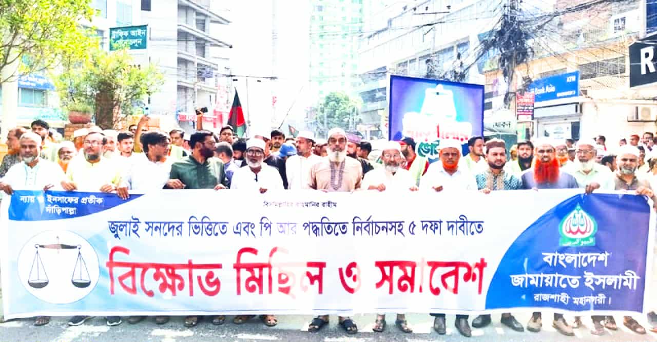 নাজিম হাসান.রাজশাহী জেলা প্রতিনিধি: বাংলাদেশ জামায়াতে ইসলামী রাজশাহী মহানগরীর উদ্যোগে জুলাই সনদের ভিত্তিতে ও পি.আর পদ্ধতিতে নির্বাচনসহ ৫ দফা দাবিতে রাজশাহীতে জামায়াতের বিক্ষোভ সমাবেশ অনুষ্ঠিত হয়েছে। আজ শুক্রবার সকাল ১০ টার সময় রাজশাহী মহানগরীর গণকপাড়ায় বিক্ষোভ শেষে সমাবেশ অনুষ্ঠিত হয়।