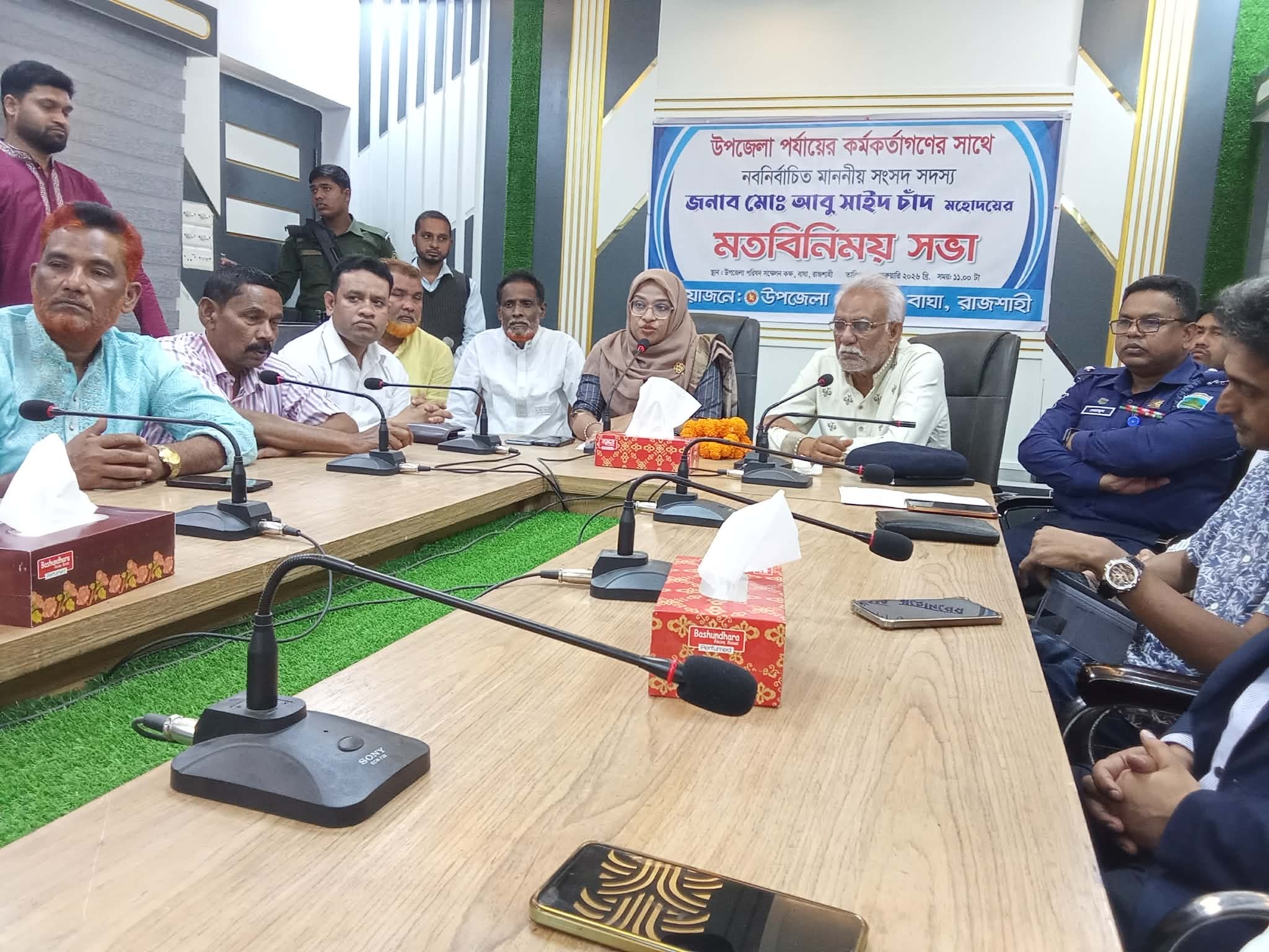 সভায় সভাপতিত্ব করেন উপজেলা নির্বাহী কর্মকর্তা (ইউএনও) শাম্মী আক্তার। উপজেলা সেবা ও সাহায্য কেন্দ্রের কর্মকর্তা মনসুর আলীর সঞ্চালনায় মতবিনিময় সভায় পরিচয় পর্ব শেষে বক্তব্য রাখেন, বাঘা থানার ভারপ্রাপ্ত কর্মকর্তা (ওসি) সেরাজুল হক,উপজেলা সমাজসেবা কর্মকর্তা খন্দকার মাসুদ রানা, বাঘা প্রেস ক্লাবের আহ্বায়ক আব্দুল লতিফ মিঞা রষ প্রমুখ ।