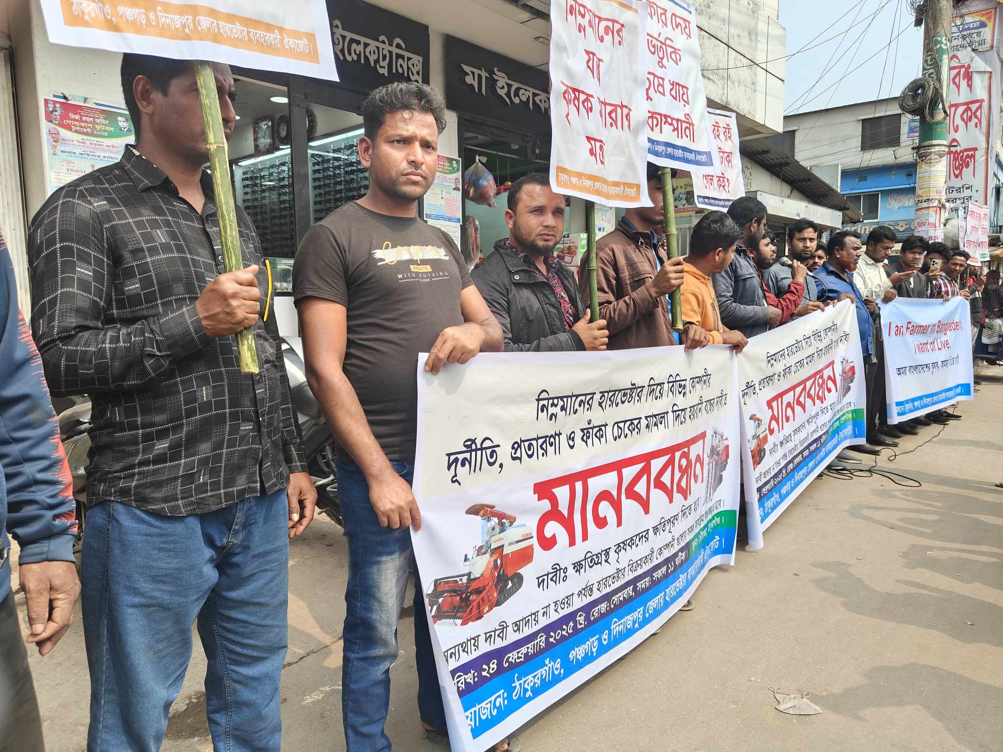 নিম্নমানের হারভেষ্টার দিয়ে বিভিন্ন কোম্পানীর দূর্নীতি, প্রতারণা ও ফাঁকা চেকের মামলা দিয়ে হয়রানী বন্ধের দাবিতে মানববন্ধন পালন করা হয়। সোমবার শহরের চৌরাস্থায় ঘন্টাব্যাপী এ মানববন্ধন পালিত হয়।
