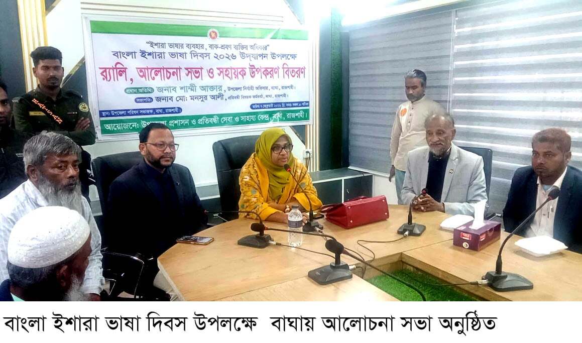 বিশেষ প্রতিনিধি: বাংলা ইশারা ভাষা দিবস উপলক্ষে রাজশাহীর বাঘায় র্যালী, আলোচনা সভা ও সহায়ক উপকরণ বিতরণ করা হয়েছে। ‘ইশারা ভাষার ব্যবহার , বাক শ্রবন ব্যক্তির অধিকার’ এই প্রতিপাদ্য বিষয় নিয়ে শনিবার (০৭-০২-২০২৬) সকাল ১১টায় এর আয়োজন করেন উপজেলা প্রশাসন ও প্রতিবন্ধী সেবা ও সাহায্য কেন্দ্র। প্রধান অতিথি ছিলেন উপজেলা নির্বাহি অফিসার শাম্মী আক্তার।