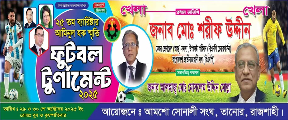 মমিনুল ইসলাম মুন বিশেষ প্রতিনিধি : রাজশাহীর তানোরে বাংলাদেশ জাতীয়তাবাদী দল (বিএনপি)-এর ভাইস-চেয়ারম্যান ও সাবেক ডাক ও টেলিযোগাযোগ মন্ত্রী প্রয়াত ব্যারিস্টার আমিনুল হক স্মৃতি ২৫তম ফুটবল টুর্নামেন্ট-২০২৫ শুরু হচ্ছে আগামী ২৯ অক্টোবর বুধবার। তানোর উপজেলার আমশো, মথুরাপুর ও তাঁতিয়ারপাড়ার সমন্বয়ে গঠিত আমশো সোনালী সংঘের উদ্যোগে এবং স্থানীয় ক্রীড়ামোদীদের সার্বিক সহযোগিতায় উত্তরাঞ্চলের অন্যতম বৃহৎ এই ফুটবল আসরটি অনুষ্ঠিত হবে ঐতিহ্যবাহী আমটিয়ারা মাঠে।