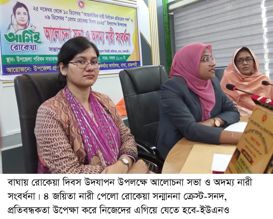 বিশেষ প্রতিনিধি: ‘আমরা সমাজেরই অর্ধাঙ্গ। আমরা পড়িয়া থাকিলে সমাজ উঠিবে কি রূপে?’ নারী পুরুষের সমতা ও সমঅধিকারের ভিত্তিতে সমাজ প্রতিষ্ঠার এই তাগিদ দিয়ে নারীর জন্য লড়েছেন মহীয়সী বেগম রোকেয়া। নারীকে সমাজে প্রতিষ্ঠিত করতে তাঁর উপলব্ধি, দর্শন ও আদর্শের প্রতি শ্রদ্ধা জানিয়ে ক্ষণজন্মা মহীয়সী এই নারীর জন্ম ও মৃত্যুদিন ঘিরে প্রতিবছরের ন্যায় এবারও দিবসটি পালন করা হয়। মঙ্গলবার(০৯-১২-২০২৫) আন্তর্জাতিক নারী নির্যাতন পক্ষ ও রোকেয়া দিবস উদযাপন উপলক্ষে বাঘা উপজেলা পরিষদের সম্মেলন কক্ষে আয়োজিত আলোচনা সভা ও অদম্য নারী সংবর্ধনা অনুষ্ঠানে চার নারীদের হাতে রোকেয়া পদক ও সনদ তুলে দেওয়া হয়।