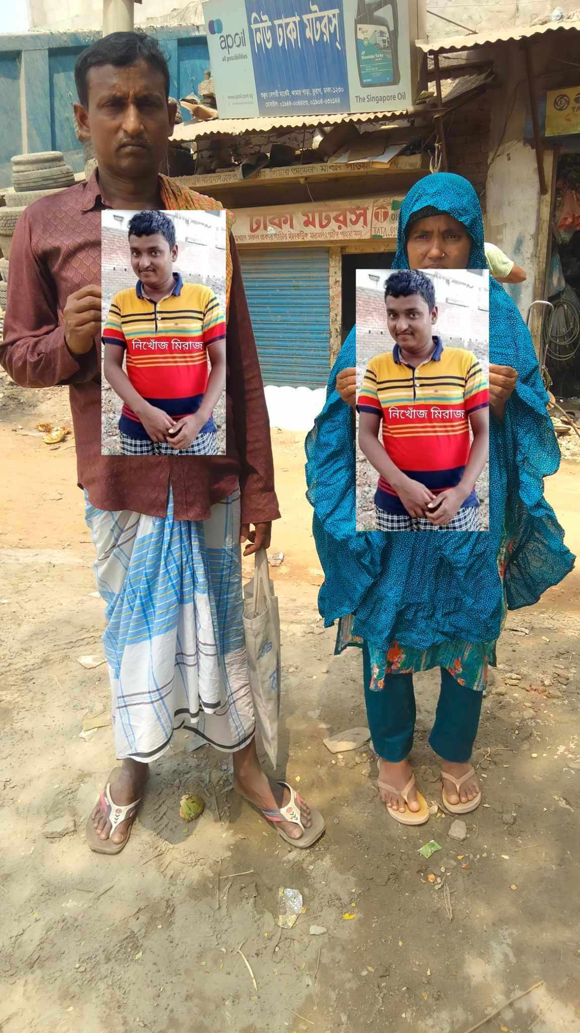 বুদ্ধি প্রতিবন্ধী ছেলেটির নাম মিরাজ, বয়স ২০ বছর । সে ২০২৩ইং সালের জুলাই মাসের ৬ তারিখ রাতে রাজধানীর তুরাগ থানার ধউর এলাকা থেকে নিখোঁজ হন । নিখোঁজ হওয়ার পর থেকেই তাকে খুঁজে পেতে দেশের বিভিন্ন জেলায় হন্য হয়ে ঘুরতেছেন তার বাবা দিনমজুর কালাম শেখ ও মা মিনা বেগম । ২৫শে এপ্রিল ২০২৪ইং তারিখ দুপুর ২টার দিকে ছেলের ছবি হাতে করে এই দম্পতিকে কান্নাকাটি করতে দেখা যায় ডিয়াবাড়ি এলাকায় । আর সেখানেই তাদের সাথে কথা হয় প্রতিবেদকের ।