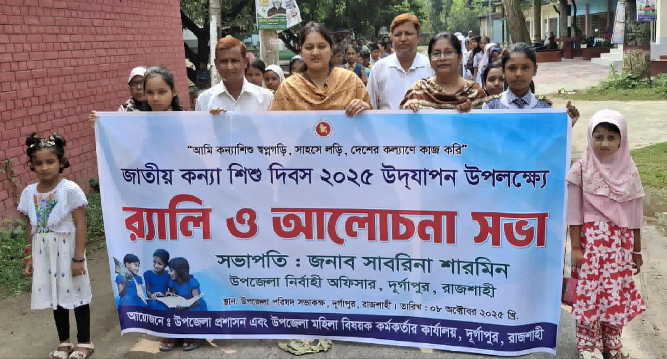 # এম আর মানিক, দূর্গাপুর, রাজশাহী : পবিত্র কুরআন থেকে তেলাওয়াত এবং পবিত্র গীতা পাঠ এর মধ্য দিয়ে অনুষ্ঠানটির সূচনা করা হয়। কোরআন থেকে তেলাওয়াত পাঠ করেন কিশোর কিশোরী ক্লাবের সদস্য মিনহাজ মোল্লাএবংগীতা পাঠ করেন মনিষা দাস। "আমি কন্যা শিশু স্বপ্নগড়ি,সাহসে লড়ি,দেশের কল্যাণে কাজ করি, এই স্লোগানকে সামনে রেখে জাতীয় কন্যা শিশু দিবস ২০২৫ উদযাপন উপলক্ষে র্যালি ও আলোচনা সভা অনুষ্ঠিত হয়েছে। (৮ অক্টোবর বুধবার) বেলা১১ টায় জাতীয় কন্যা শিশু দিবস ২০২৫ র্যালি শেষে দূর্গাপুর উপজেলা পরিষদ সভাকক্ষে আলোচনা সভা অনুষ্ঠিত হয় ।
