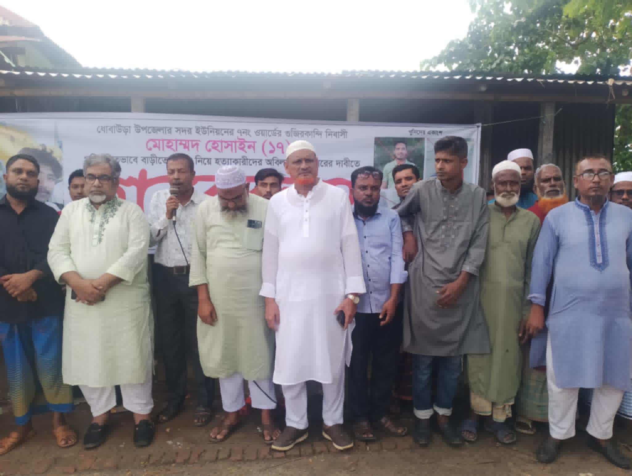 মানববন্ধনে অপরাধীদের দ্রুত গ্রেপ্তার ও দৃষ্টান্তমূলক শাস্তি’র দাবী করে বক্তব্য রাখেন, নেতা কর্মীরা সহ এলাকার সচেতনমহল। মানববন্ধনে এলাকাবাসী প্রশাসনের প্রতি হোসাইন হত্যার আসামিদের দ্রুত গ্রেফতার করে আইনের আওতায় এনে সর্বোচ্চ শাস্তি ফাঁসির দাবি জানান। নিহত হোসাইন ,গুজিরকান্দি গ্রামের ছায়েদুল ইসলামের ছেলে।