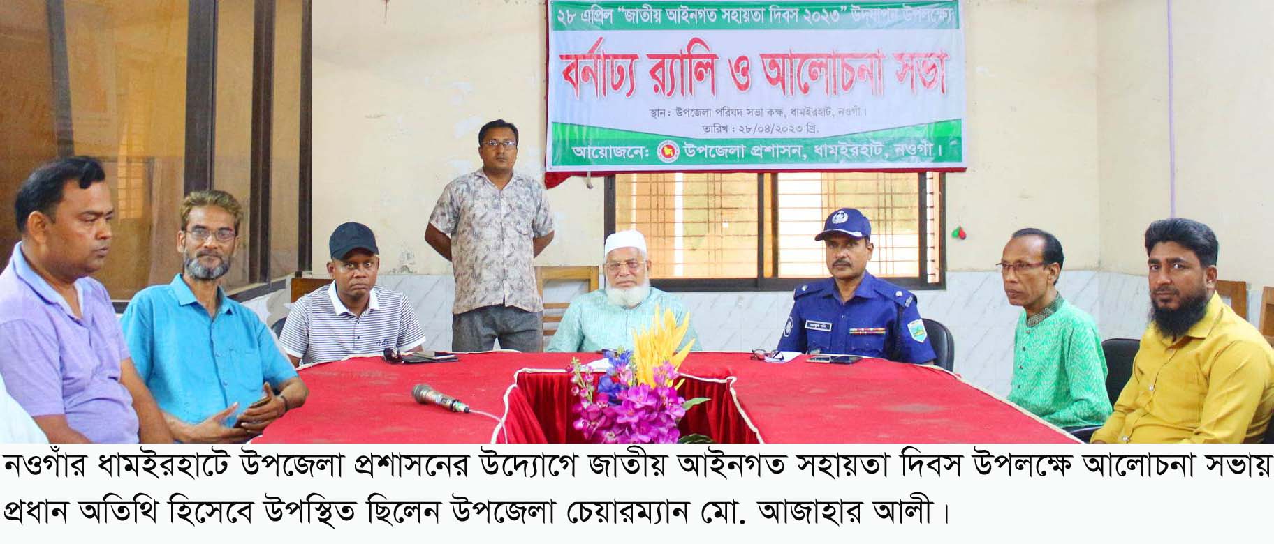 নওগাঁর ধামইরহাটে উপজেলা প্রশাসনের উদ্যোগে জাতীয় আইন সহায়তা দিবস উপলক্ষে র্যালী ও আলোচনা সভা অনুষ্ঠিত হয়েচে। ২৮ এপ্রিল (শুক্রবার) সকাল ১০ টায় উপজেলা চত্বর থেকে একটি র্যালী বের করা হয়। র্যালী শেষে উপজেলা পরিষদ সভাকক্ষে ইউএনও মো. আরিফুল ইসলামের সভাপতিত্বে আলোচনা সভা অনুষ্ঠিত হয়।