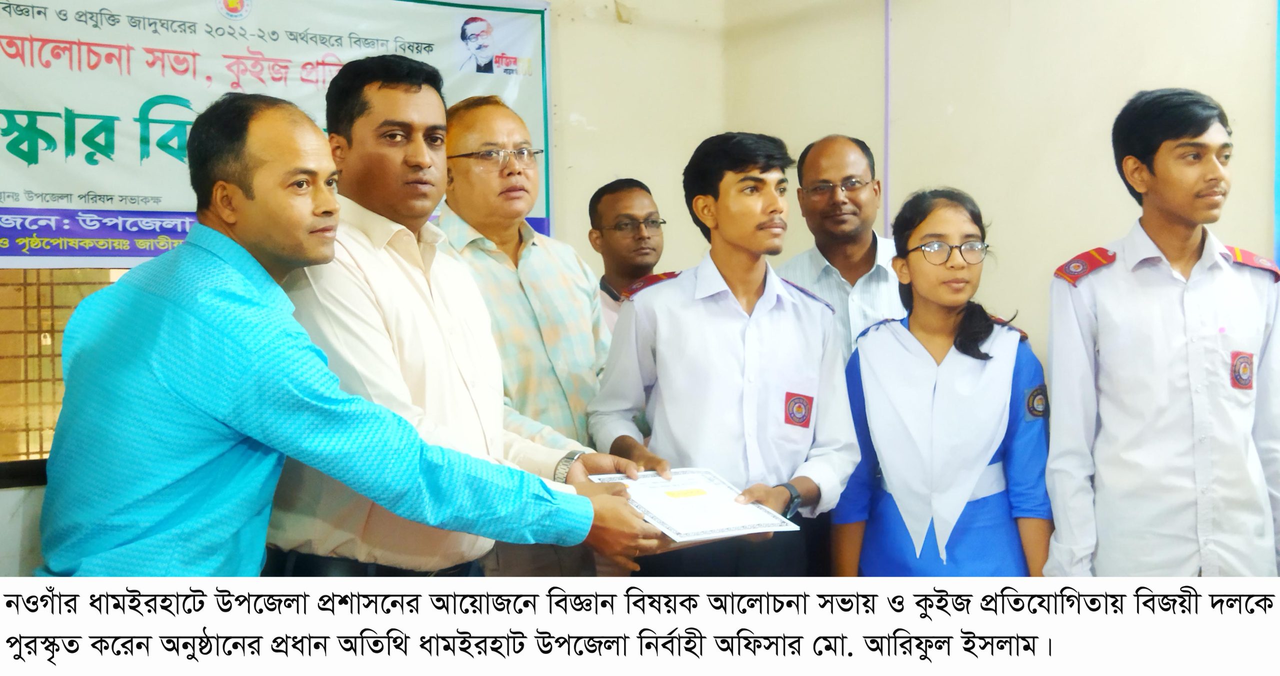 নওগাঁর ধামইরহাটে বিজ্ঞান বিষয়ক আলোচনা সভা, কুইজ প্রতিযোগিতা ও পুরস্কার বিতরণ অনুষ্ঠান অনুষ্ঠিত হয়েছে। ধামইরহাট উপজেলা প্রশাসনের আয়োজনে ২৪ অক্টোবর সকাল ১০ টায় উপজেলা পরিষদ সম্মেলন কক্ষে জাতীয় বিজ্ঞান ও প্রযুক্তি জাদুঘরের তত্বাবধানে ও বিজ্ঞান ও প্রযুক্তি মন্ত্রনালয়ের পৃষ্ঠপোষকতায় আলোচনা সভা ও কুইজ প্রতিযোগিতায় উপজেলার ১২টি মাধ্যমিক বিদ্যালয়ের শিক্ষার্থীরা অংশগ্রহণ করেন।