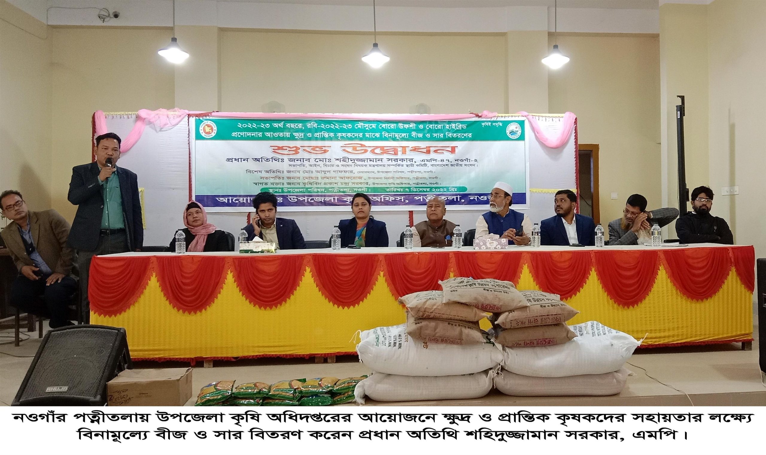 বুধবার উপজেলা নির্বাহী অফিসার মোছাঃ রুমানা আফরোজের সভাপতিত্বে প্রণোদনা কর্মস‚চীর উদ্বোধনীতে ক্ষুদ্র ও প্রান্তিক কৃষকদের সহায়তার লক্ষ্যে সার ও বীজ বিতরণ করেন প্রধান অতিথি বাংলাদেশ জাতীয় সংসদের আইন, বিচার ও সংসদ বিষয়ক মন্ত্রণালয় সম্পর্কিত স্থায়ী কমিটির সভাপতি ও ৪৭ নওগাঁ-২ সংসদ সদস্য শহিদুজ্জামান সরকার। স্বাগত বক্তব্য রাখেন উপজেলা কৃষি কর্মকর্তা প্রকাশ চন্দ্র সরকার।