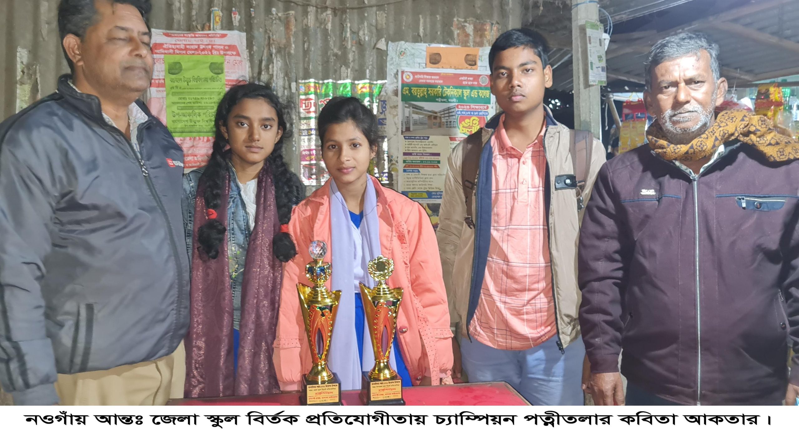 গত বুধবার আন্তঃ জেলা স্কুল বির্তক প্রতিযোগীয় জেলার তিন উপজেলার স্কুলের শিক্ষার্থীদের অংশগ্রহনে নিয়ামতপুর উপজেলা অডিটরিয়ামে অনুষ্ঠিত হয়। “যৌন নির্যাতন প্রতিরোধে ছাত্র সমাজের ভূমিকাই মূখ্য” এই আলোচ্য বিষয়কে সামনে রেখে বির্তক প্রতিযোগীতায় অংশগ্রহনকারী প্রতিযোগী শিক্ষার্থীরা তাদের বক্তব্য তুলে ধরেন। এতে বিচারকের রায়ে পত্নীতলার গাহন উচ্চ বিদ্যালয়ের ৮ম শ্রেণীর ছাত্রী কবিতা আখতার চ্যাম্পিয়ন হয়। কবিতা আখতার গাহন গ্রামের মোস্তাফিজুর রহমানের মেয়ে।#