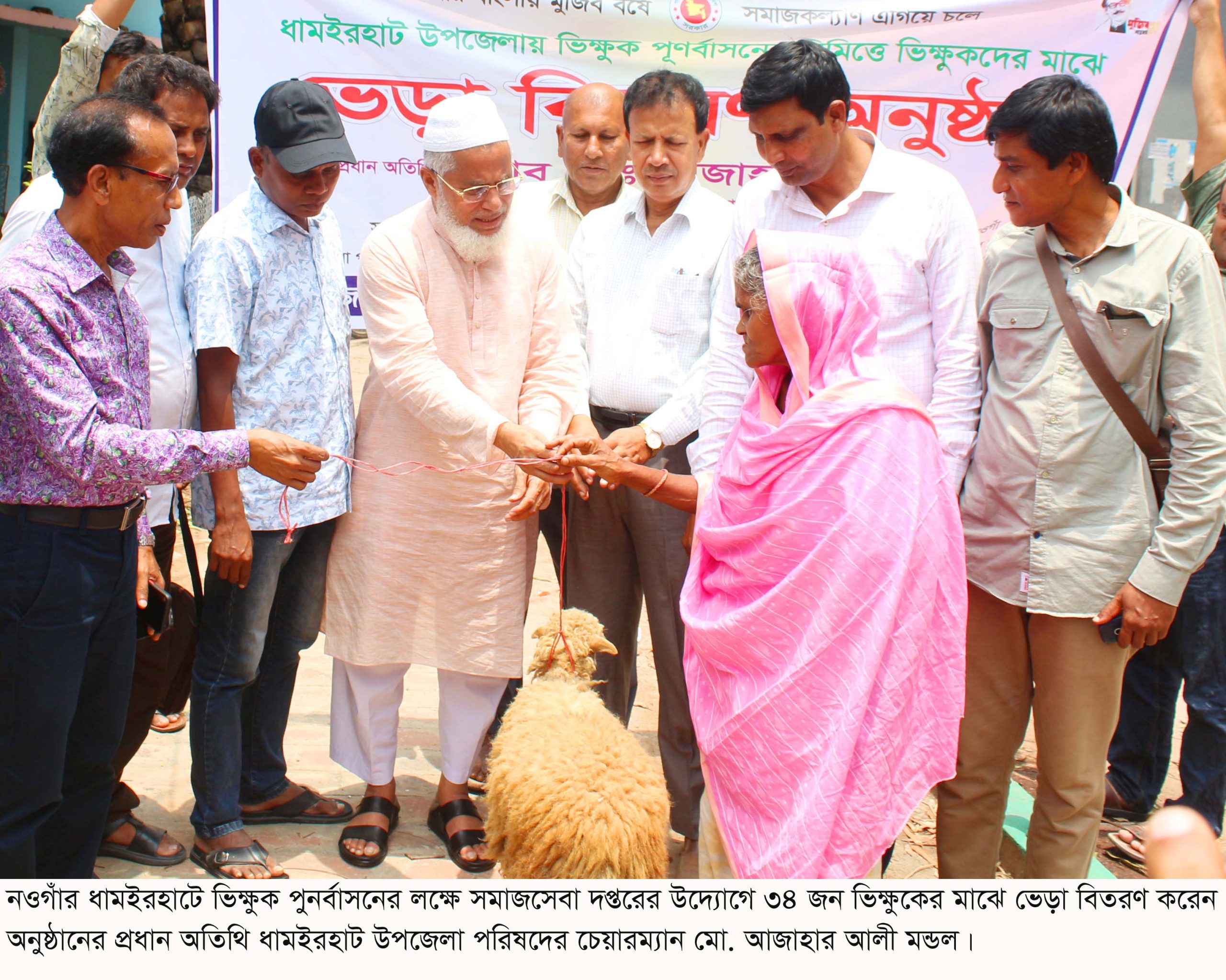 নওগাঁর ধামইরহাটে ভিক্ষুক পুনর্বাসনের লক্ষে ধামইরহাট উপজেলা সমাজসেবা দপ্তরের উদ্যোগে ৩৪ জন ভিক্ষুকের মাঝে ভেড়া বিতরণ করা হয়েছে। ১৪ জুন বেলা ১১ টায় উপজেলা পরিষদ সভাকক্ষে উপজেলার বিভিন্ন ইউনিয়নের ৩৪ জন ভিক্ষুকের মাঝে ভেড়া বিতরণ করেন বিতরণ অনুষ্ঠানের প্রধান অতিথি উপজেলা চেয়ারম্যান মো. আজাহার আলী।