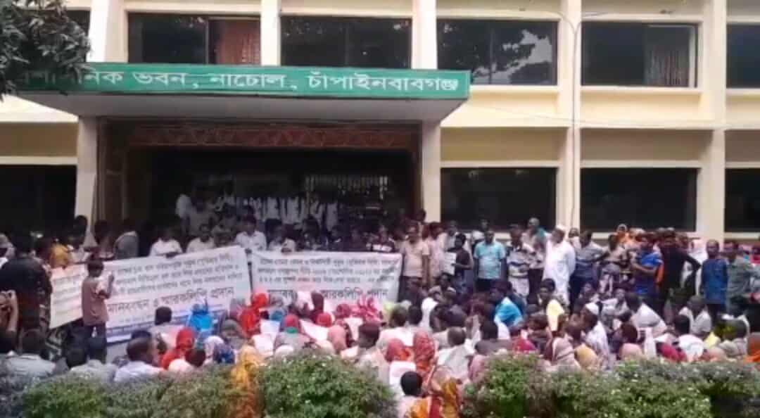 নাচোলে সুতিহার দিঘির লীজ বাতিলের দাবীতে গ্রামবাসীর মানববন্ধন ও স্মারকলিপি প্রদান