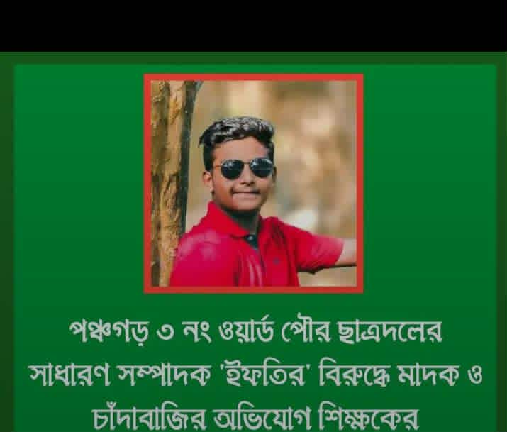 পঞ্চগড় প্রতনিধি: একজন স্কুলশিক্ষক ও প্রাইভেট টিউটর ফেসবুক পোস্টের মাধ্যমে অভিযোগ করেছেন যে, পঞ্চগড় পৌর শাখা ছাত্রদলের ৩নং ওয়ার্ডের সাধারণ সম্পাদক ইরফান সাদিক ইফতি ও তার এক সহযোগী গত কয়েকদিন ধরে নিয়মিত চাঁদা দাবি করছেন।