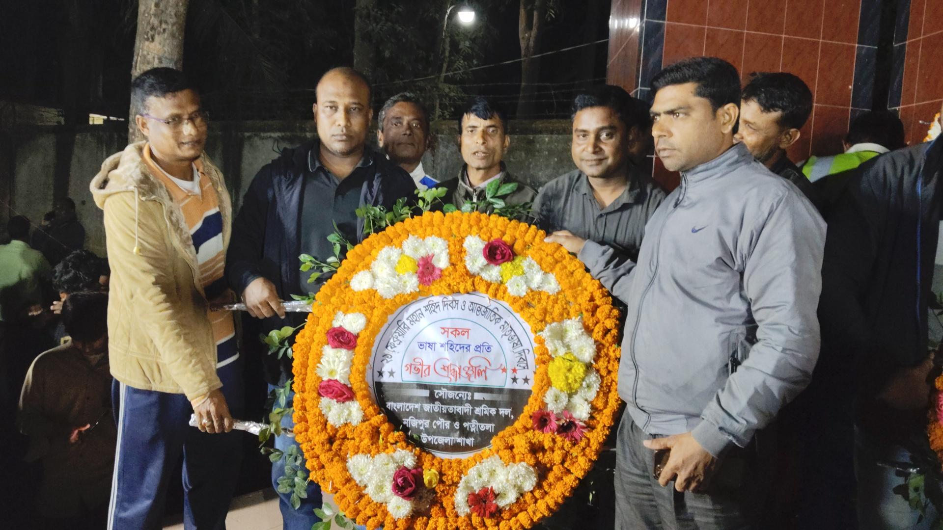 উপজেলার কেন্দ্রীয় শহীদ মিনারে উপজেলা প্রশাসন, পুলিশ প্রশাসন, নজিপুর পৌরসভা, ফায়ার সার্ভিস ও সিভিল ডিফেন্স , উপজেলা স্বাস্থ্য কমপ্লেক্স, নজিপুর বাসস্ট্যান্ড বণিক কমিটি, বৈষম্য বিরোধী ছাত্র আন্দোলন পত্নীতলা, নজিপুর উচ্চ বিদ্যালয়, বাংলাদেশ জাতীয়তাবাদী দল (বিএনপি) পত্নীতলা শাখা, মহিলা দল, যুবদল, শ্রমিক দল, ছাত্র দল, উপজেলা বিএনপির সহযোগী ও অঙ্গ সংগঠন, এনজিও ফোরাম, হাঙ্গার প্রজেক্ট সহ বিভিন্ সামাজিক ও রাজনৈতিক সংগঠনের পক্ষ থেকে পুষ্পস্তবক অর্পন করা হয়। পরে ১ মিনিট নিরবতা পালন করে শহীদের আত্মার মাগফিরাত কামনা করে দেশ ও জাতির মঙ্গল কামনায় বিশেষ মোনাজাত করা হয়। এ সময় উপস্থিত ছিলেন উপজেলা নির্বাহী অফিসার ইউএনও মোঃ আলীমুজ্জামান মিলন, সহকারী কমিশনার (ভূমি) আজিজুল কবির, স্বাস্থ্য ও প: প: কর্মকর্তা ডা. খালিদ সাইফুল্লাহ, কৃষি অফিসার কৃষিবিদ সোহরাব হোসেন, উপজেলা প্রকৌশলী ইমতিয়াজ জাহিরুল,সমাজ সেবা অফিসার ফিরোজ আল মামুন, প্রাণিসম্পদ কর্মকর্তা আশিস কুমার দেবনাথ, ওসি শাহ মোঃ এনায়েতুর রহমান, উপজেলা উদ্ভিদ সংরক্ষণ কর্মকর্তা মশিউর রহমান, পল্লী উন্নয়ন কর্মকর্তা প্রহ্লাদ কুমার কুন্ডু।