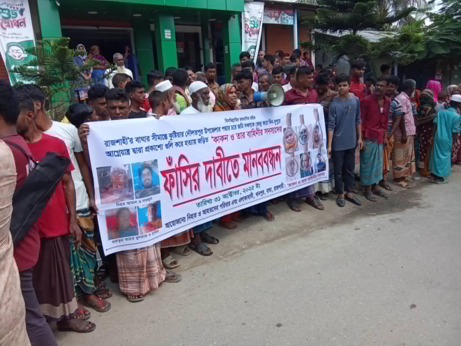 পদ্মার চরে জোড়া খু/নে/র সাথে জড়িত কাকনসহ তার বাহিনীর ফাঁসির দাবিতে বাঘায় মানববন্ধন