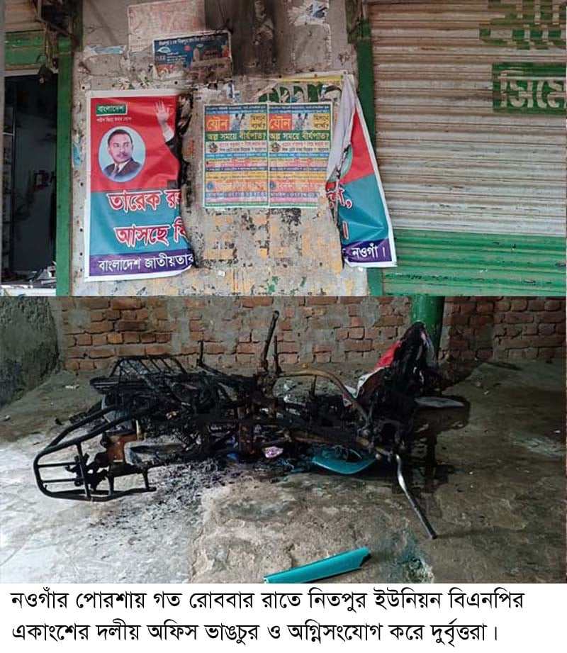 জানাগেছে, রোববার দিবাগত রাতে দুর্বৃত্তরা নিতপুর মডেল মসজিদের পাশে ইউনিয়ন বিএনপির ওই অফিস কক্ষের দরজা ভেঙ্গে প্রবেশ করে এবং অফিস কক্ষের আসবাবপত্র ভাংচুর ও বাইরে টাঙ্গানো দলীয় পোষ্টার ছিঁড়ে ফেলে। এসময় তারা কক্ষের ভিতরে আগুন ধরিয়ে দেয়। এতে অফিসে রাখা একটি মোটরসাইকেল, চেয়ার-টেবিল ও বিভিন্ন কাগজপত্র পুড়ে যায়।
